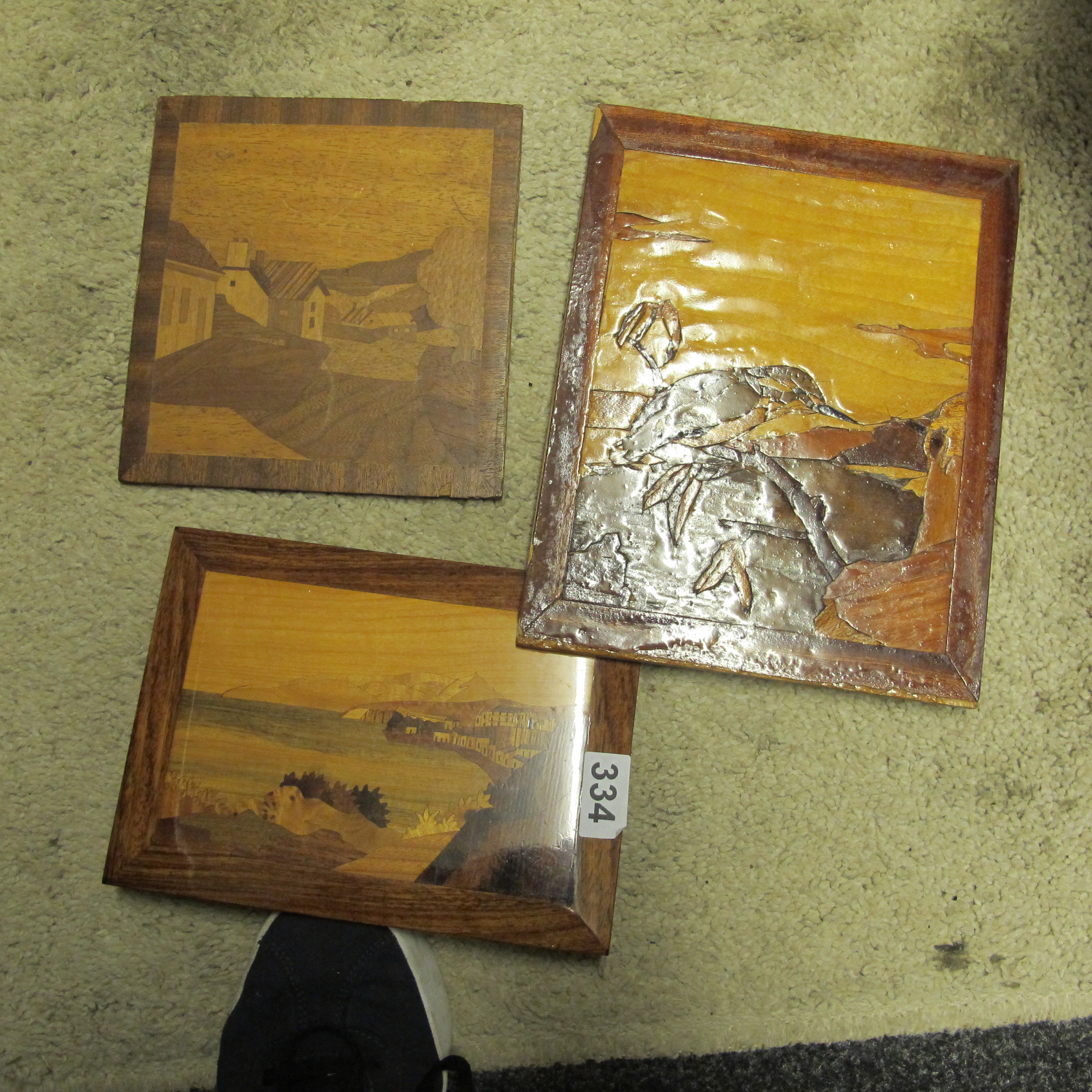 Collection of Three Mid-Century Style Wood Marquetry Panels, Landscapes and Bird