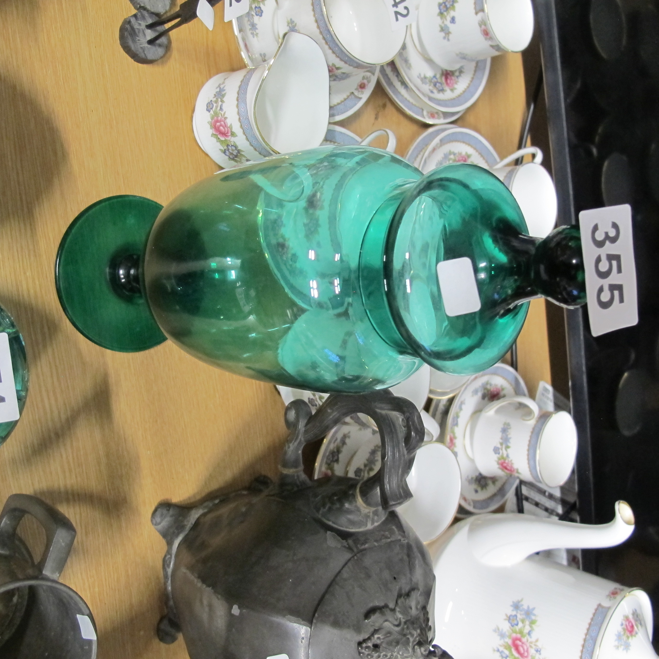 Empoli Style Emerald Green Glass Apothecary Jar, Mid-Century Modern, with Porcelain Tea Service and Metal Urn
