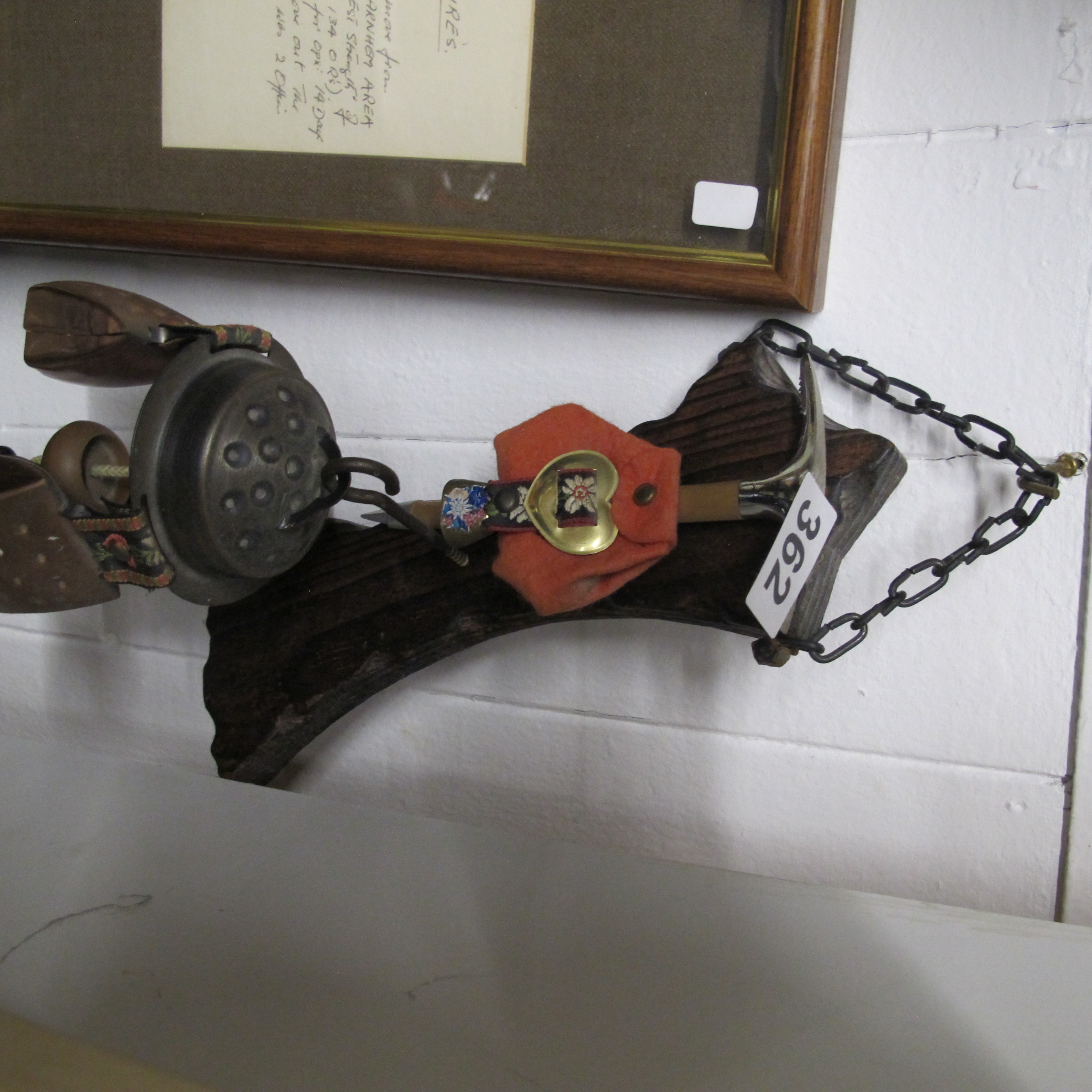 European Folk Art Alpine Souvenir Assembly, Mid-Century, Featuring Miniature Ice Axe and Cowbells