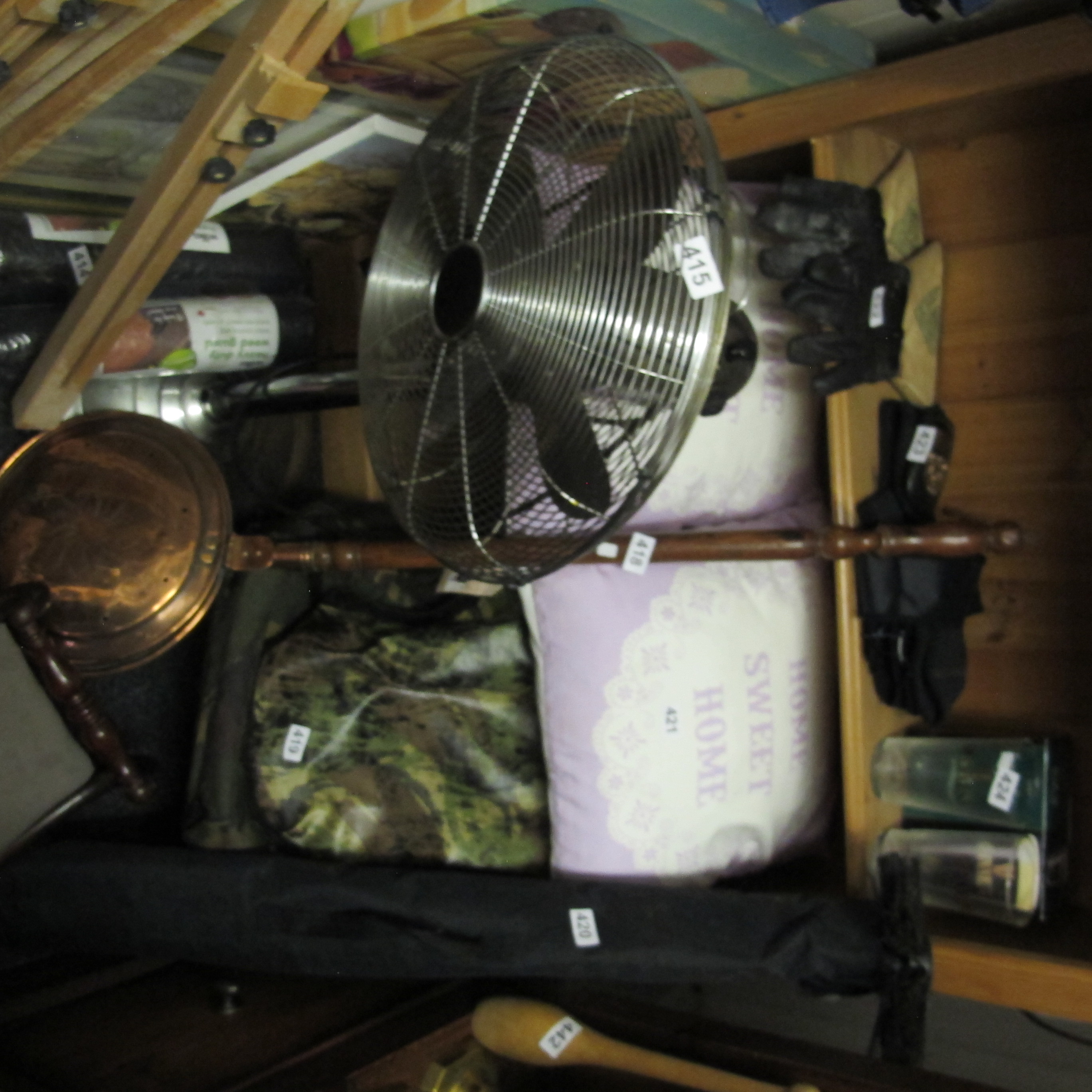 Collection of Contemporary and Traditional Household Items Featuring Industrial Style Floor Fan and Copper Warming Pan