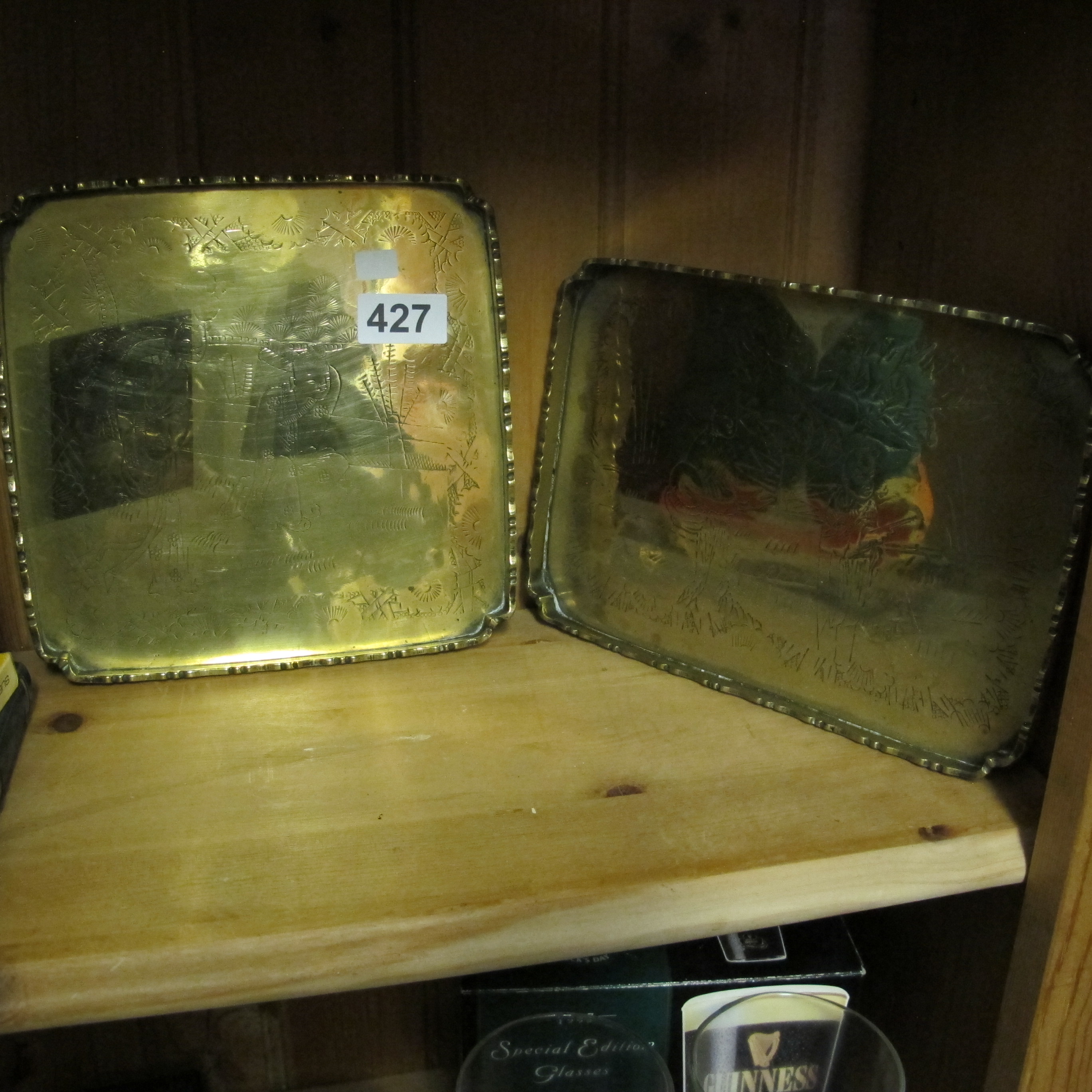Unattributed Pair of Brass Opium Trays, Chinoiserie Late 19th Century, Etched Pagoda Motifs