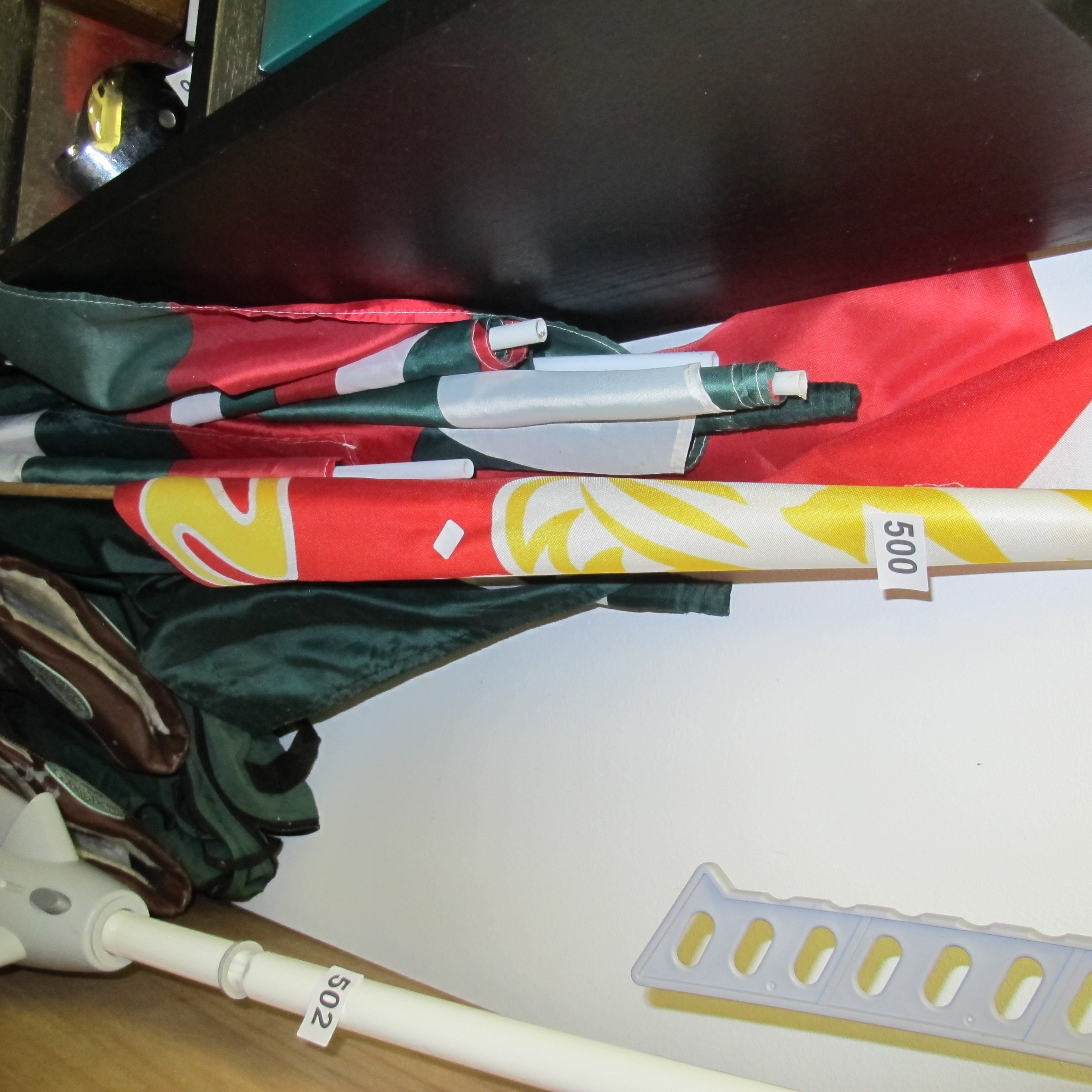 A Collection of Rolled Leicester football team Flags in Red White Yellow Green