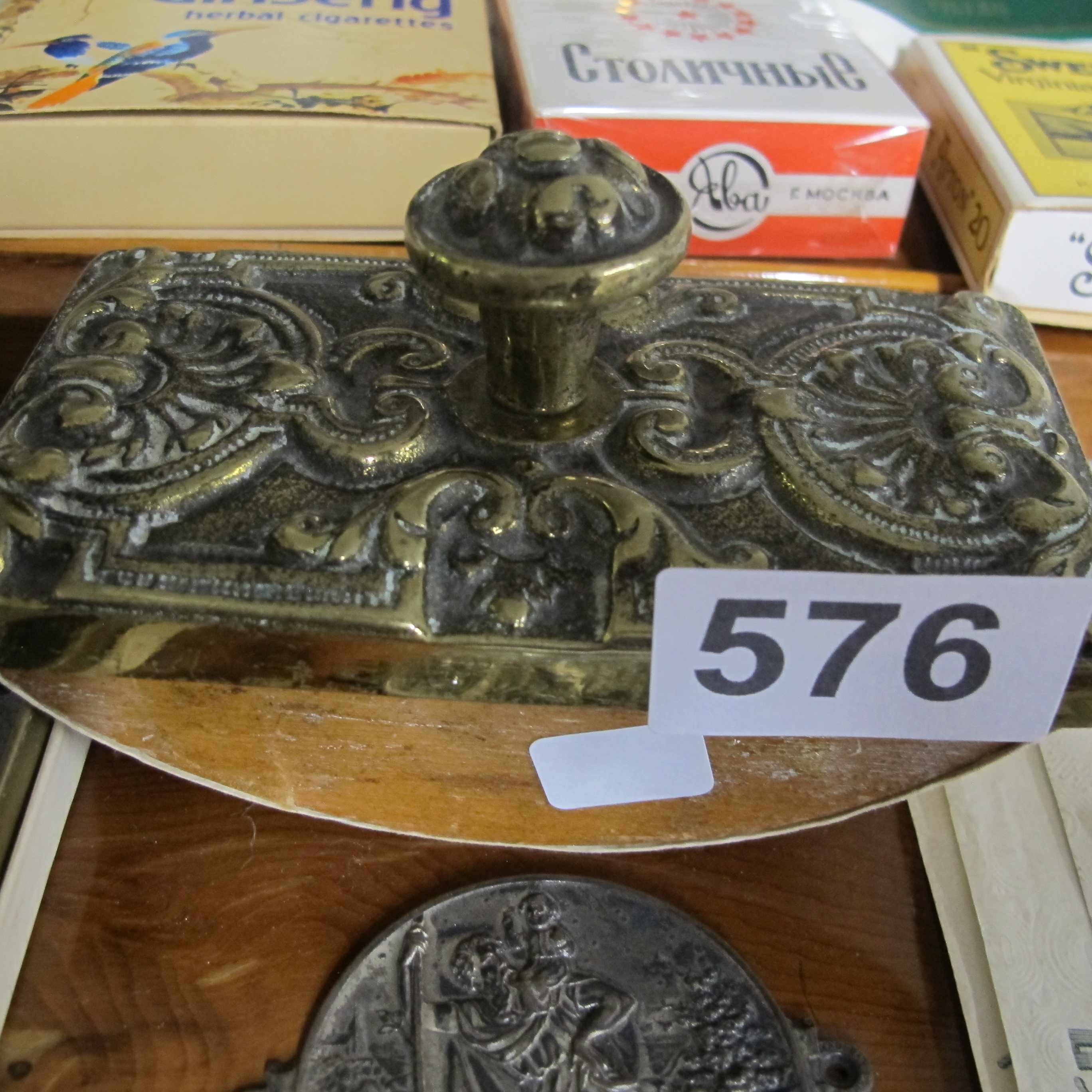 Victorian Style Ornate Cast Brass Rocker Blotter with Wooden Base