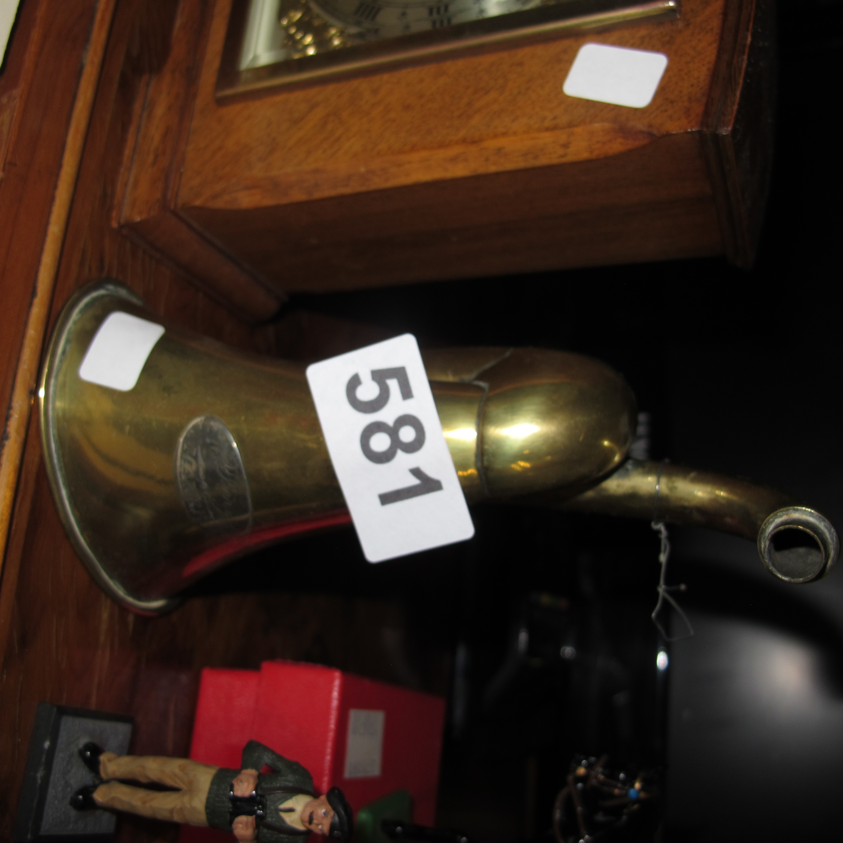 Vintage Brass Curved Signal Horn with Oval Maker’s Plate and Mantel Clock, Circa 1920