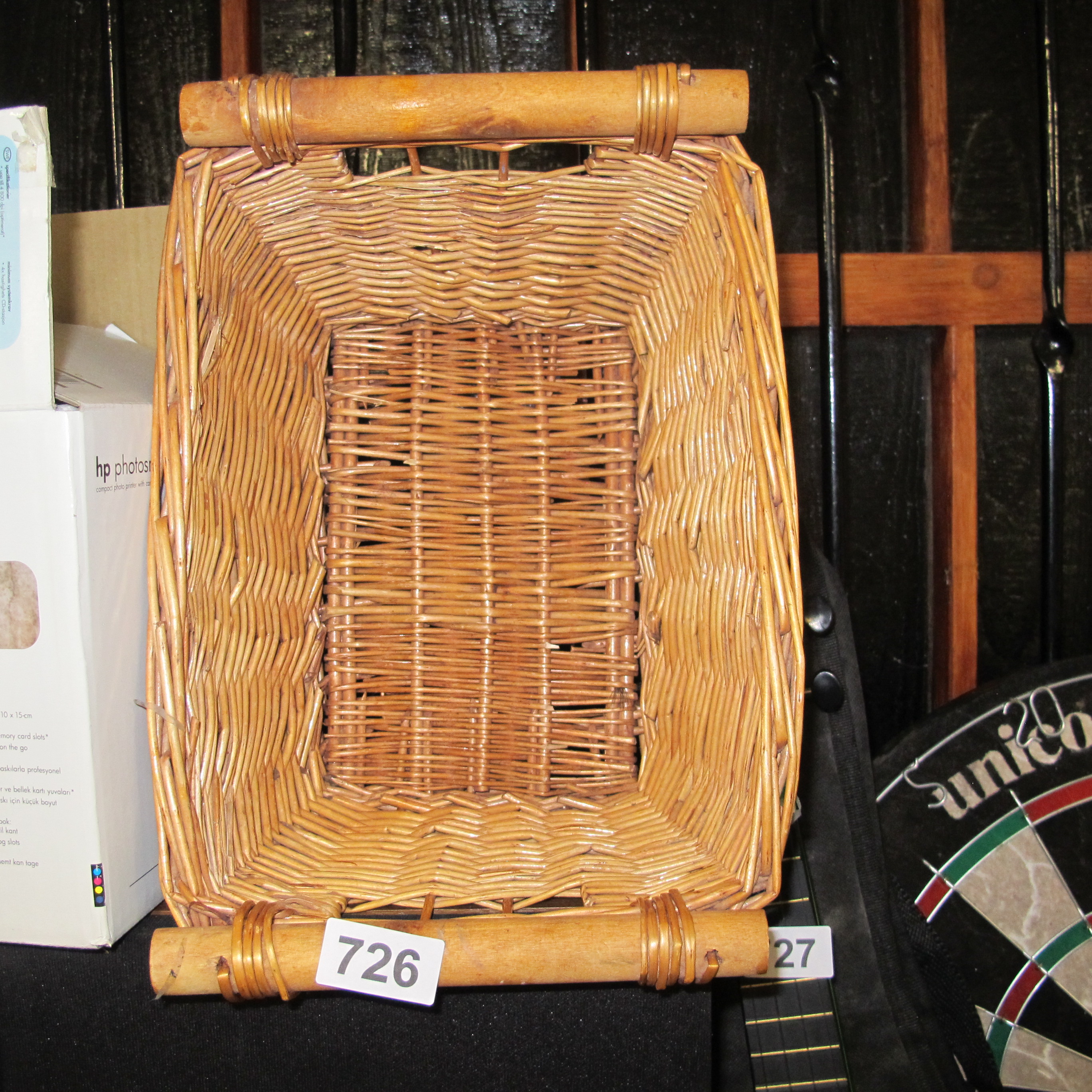 Vintage Mid-20th Century Rectangular Woven Willow Basket with Integrated Wooden Handles