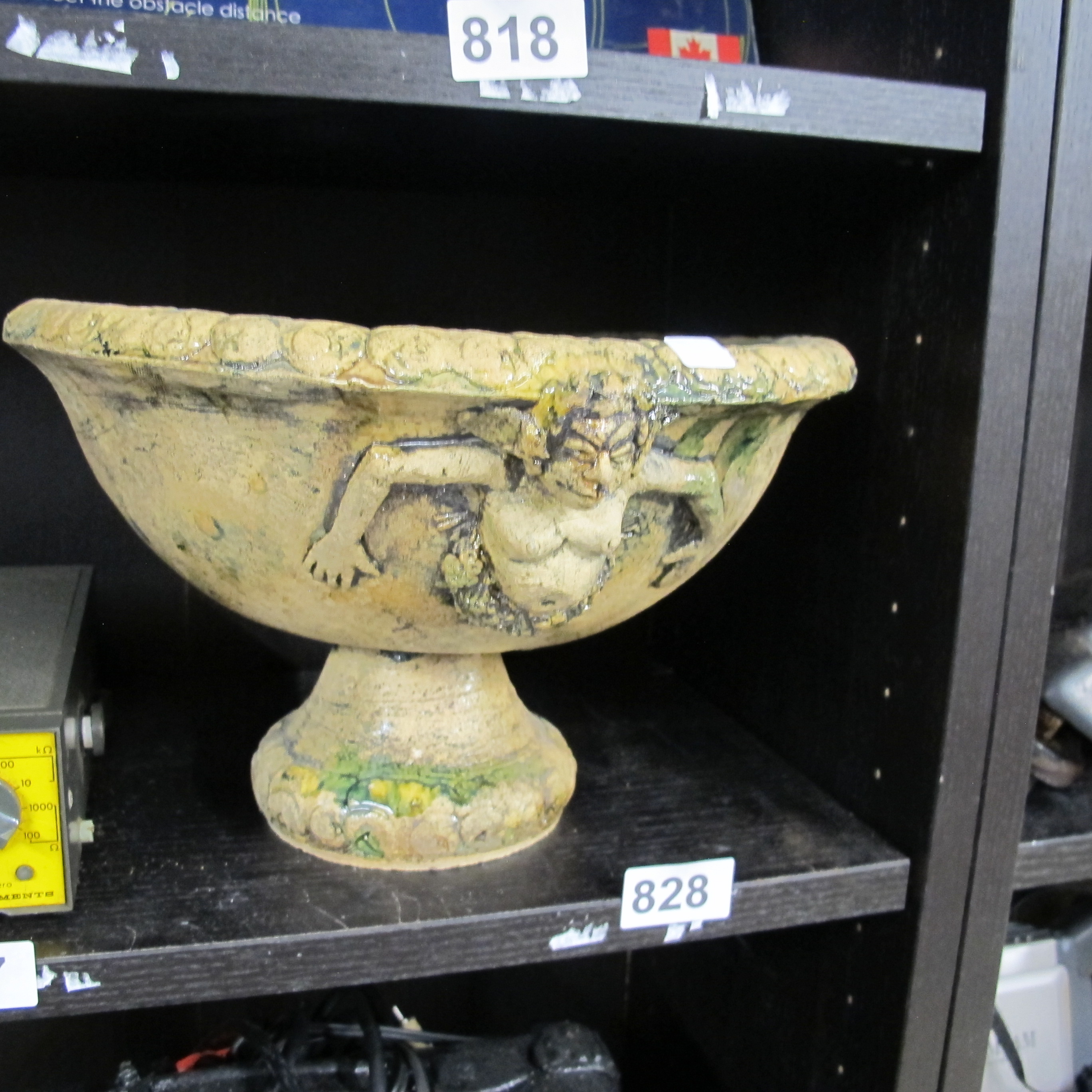 Unattributed Rustic Majolica Style Glazed Earthenware Footed Bowl with Molded Satyr Figure Category: Ceramics