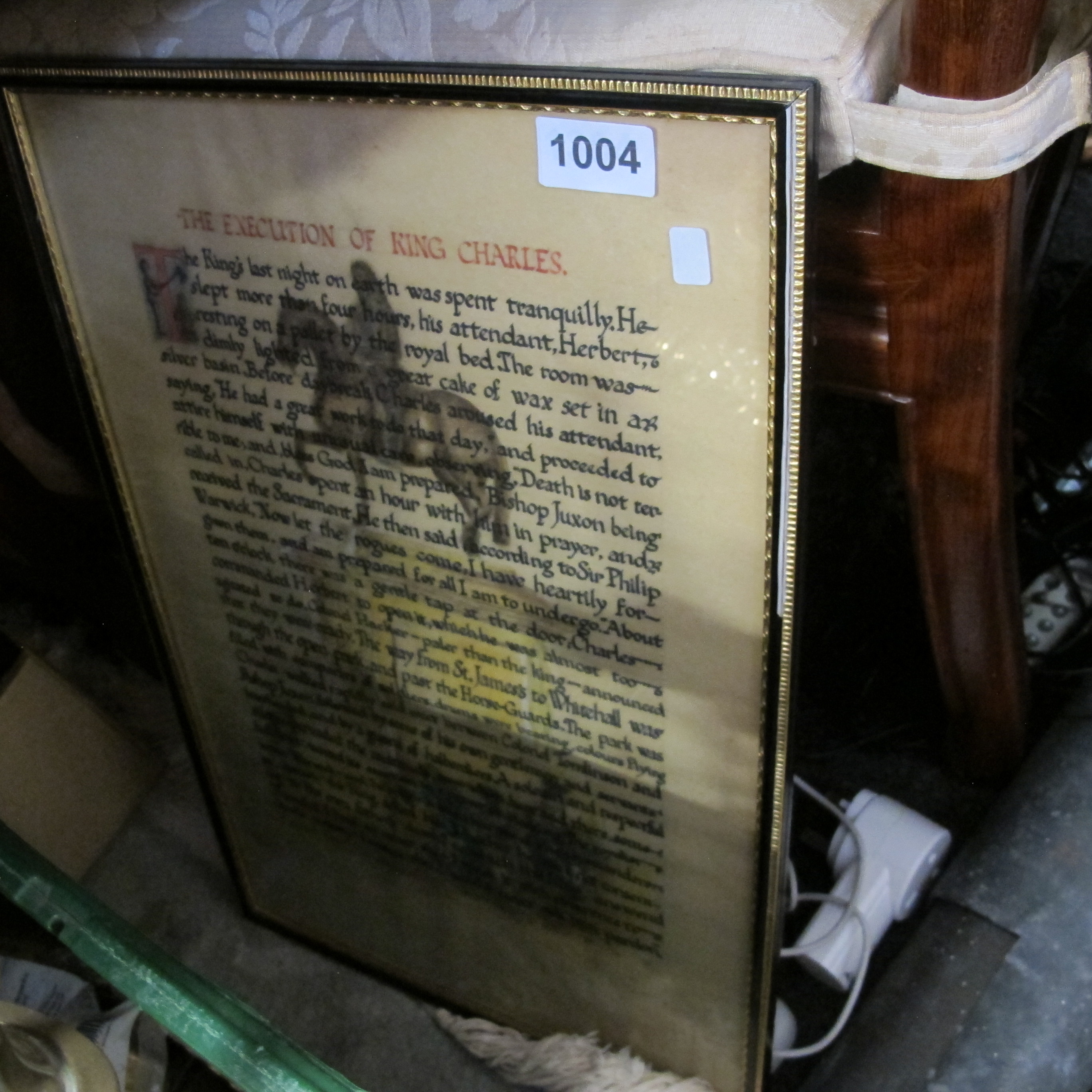 A Framed Commemorative Printed Account of The Execution of King Charles