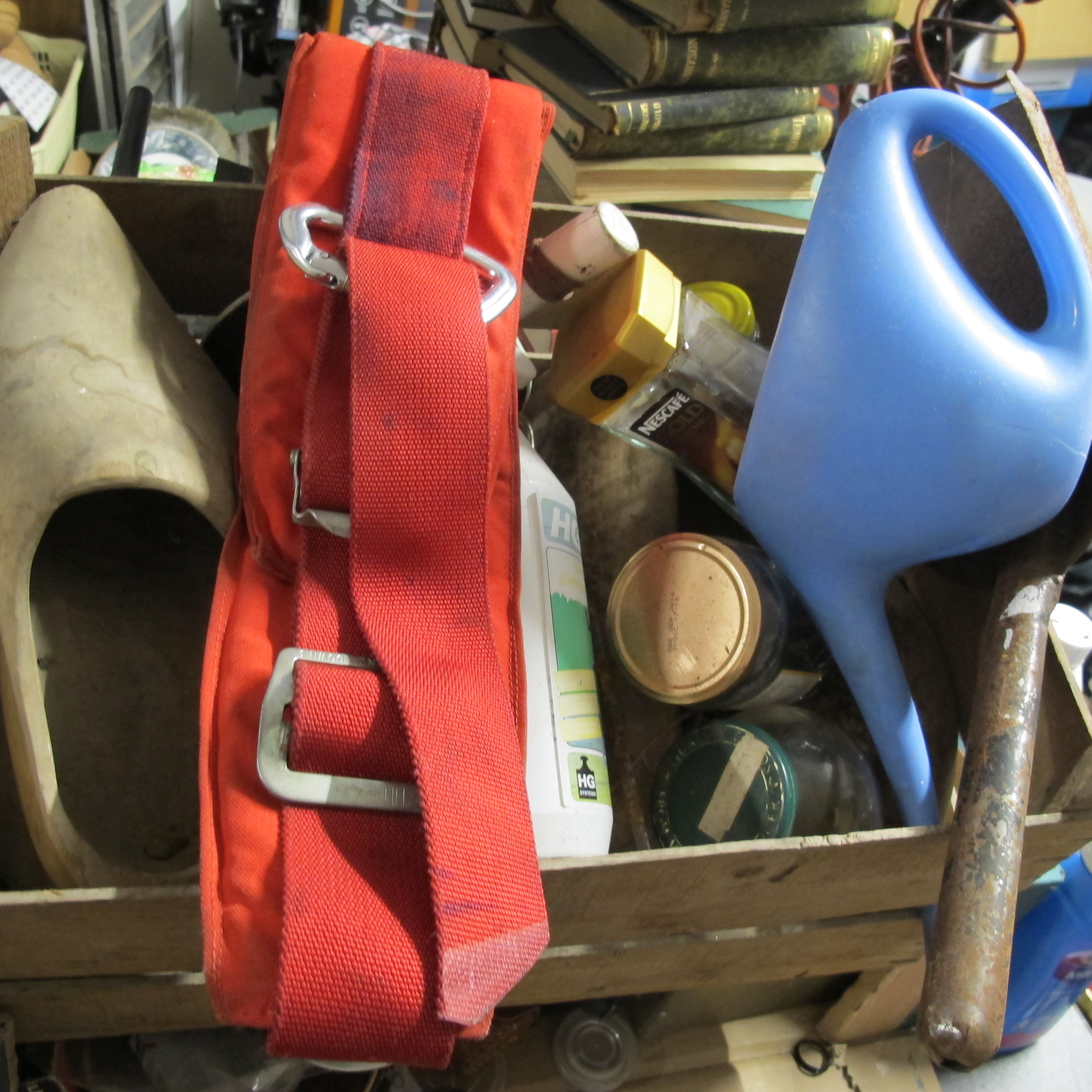 A Collection of Household and Utility Items Including a Red Fabric Pack and Sundries