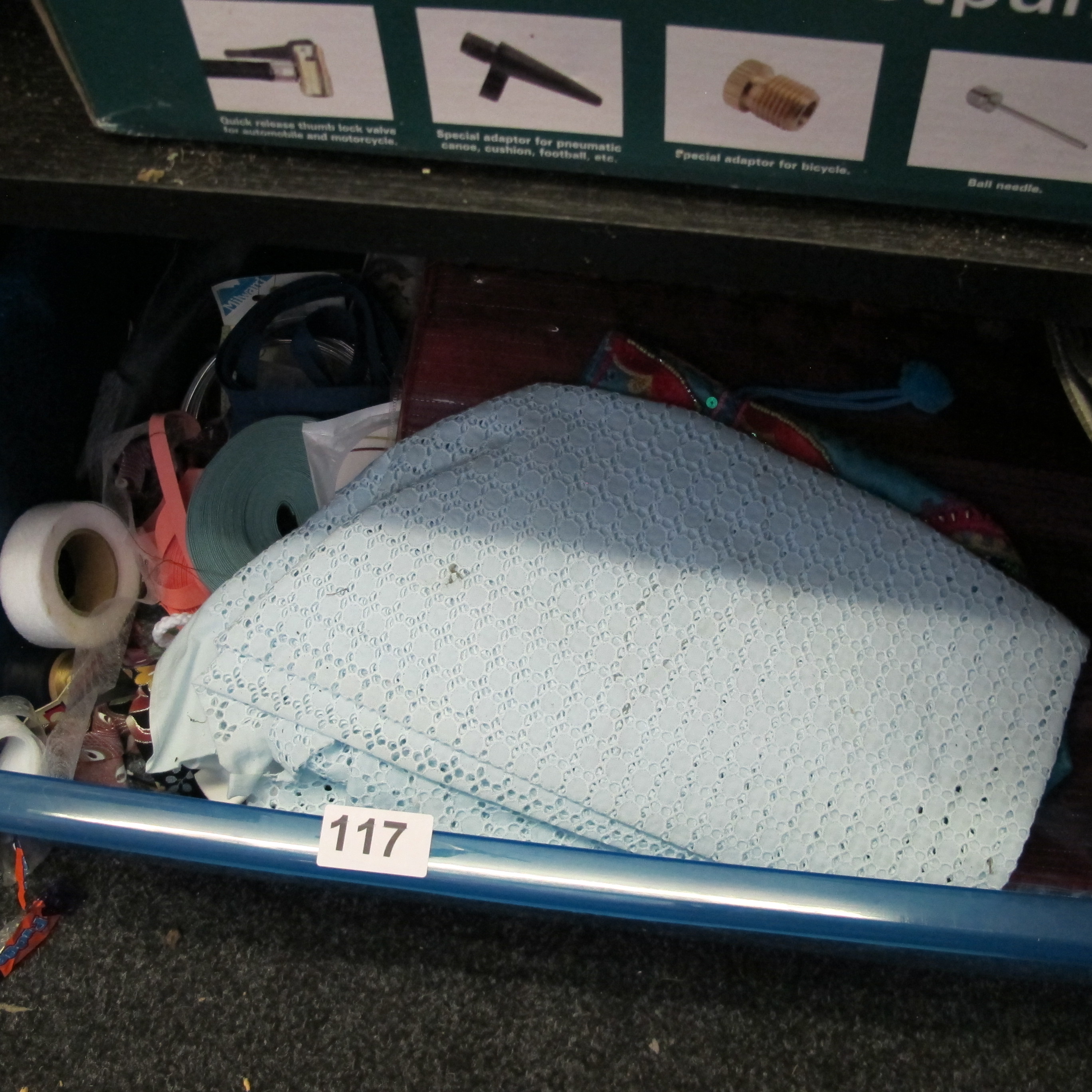 An Assortment of Sewing and Craft Supplies Including Light Blue Eyelet Fabric