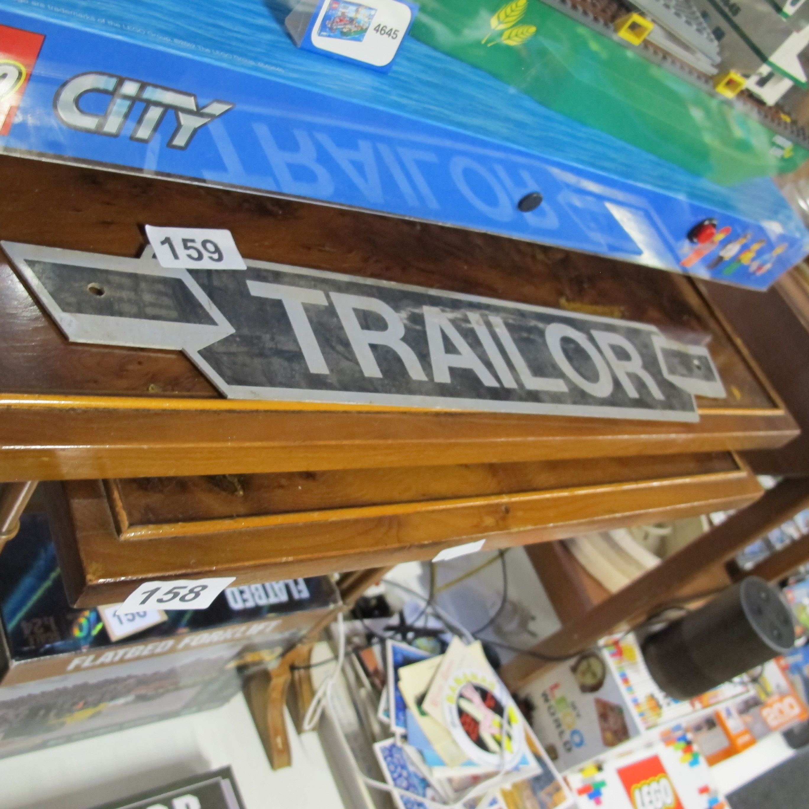A Collection of Collectibles Including a Vintage Metal Trailor Directional Sign and Lego City Sets