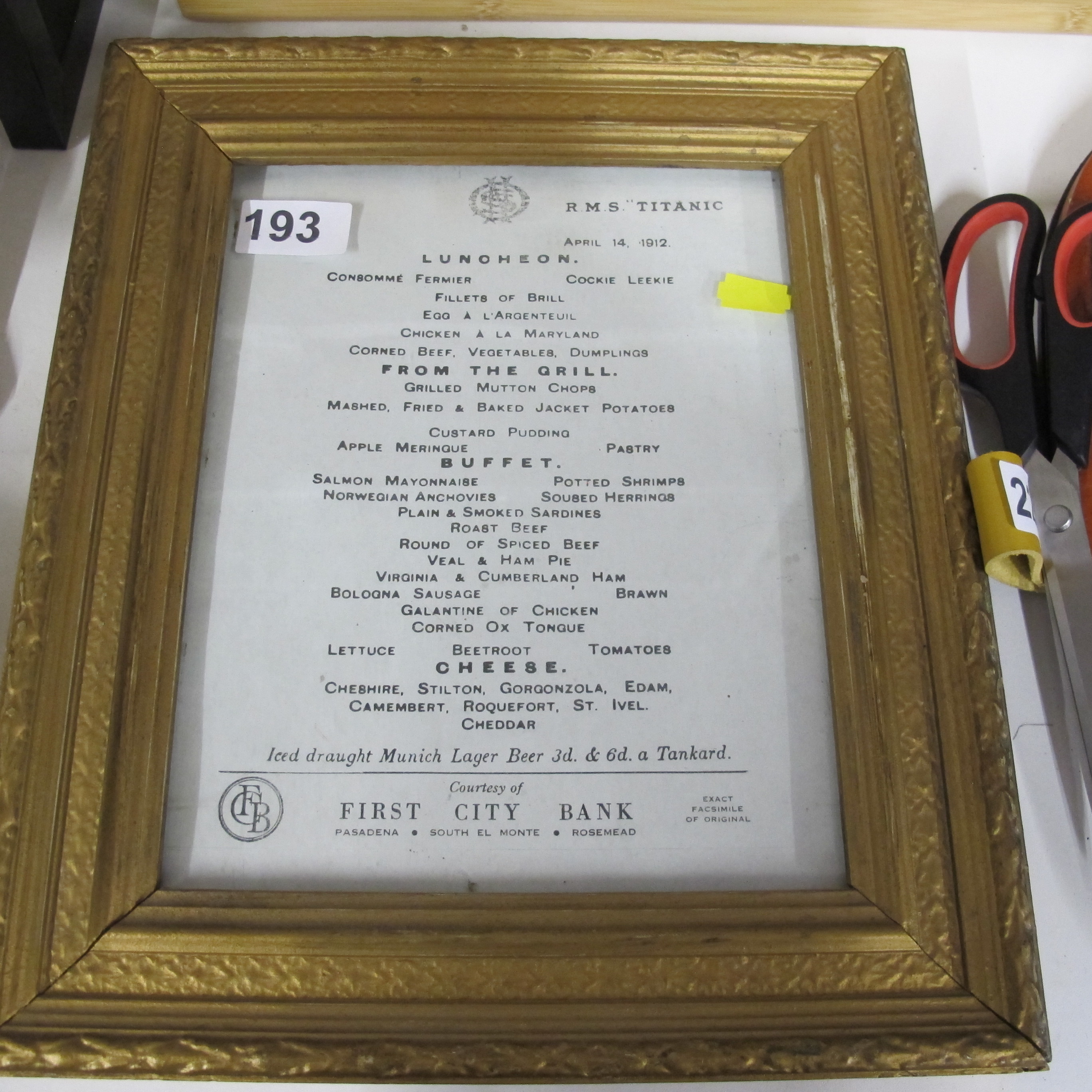 Framed R.M.S. Titanic First Class Luncheon Menu Facsimile Issued by First City Bank