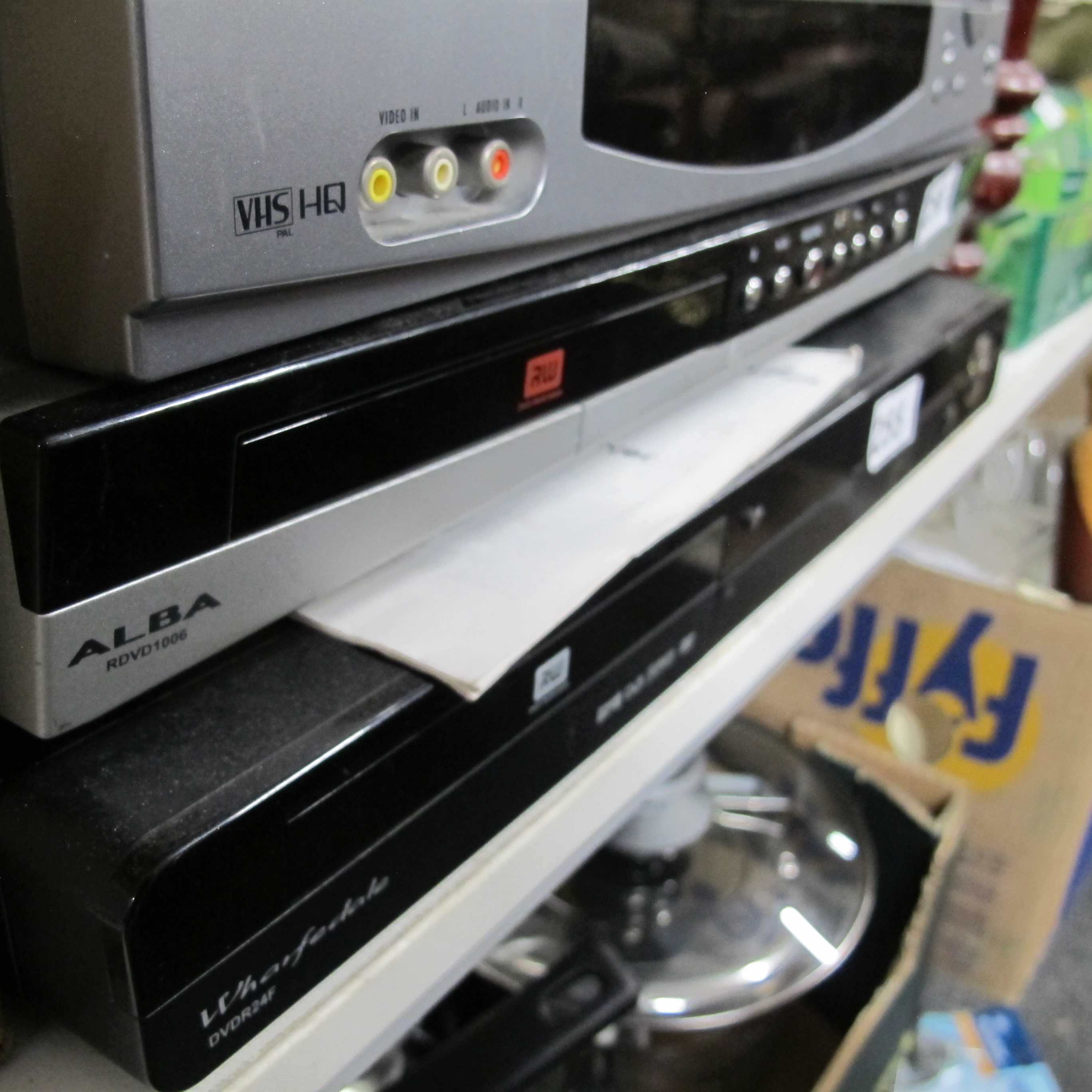 A Trio of Electronic Home Entertainment Devices Including VHS and DVD Players