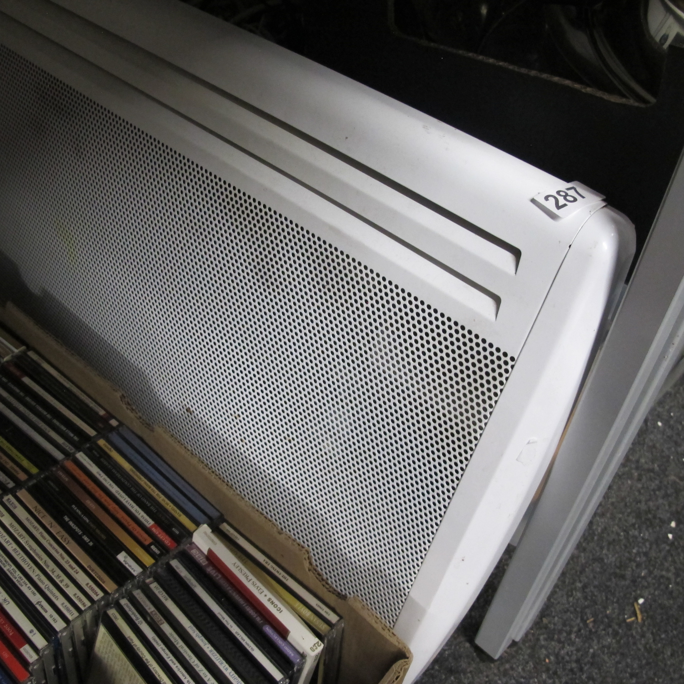 A White Electric Panel Heater and a Collection of CDs