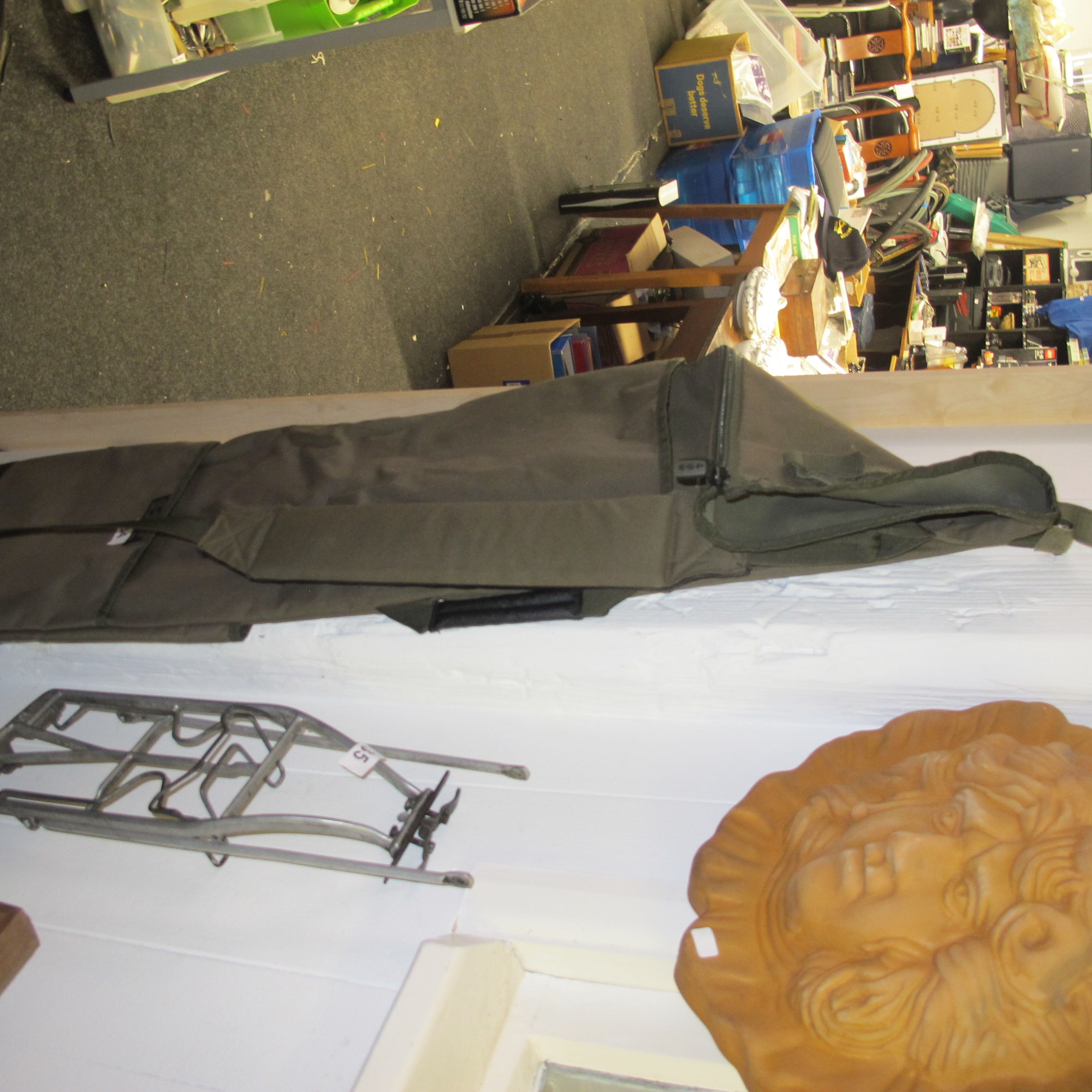 A Trio of Items Comprising a Rod Holdall, a Metal Rack, and a Terracotta Relief Sculpture