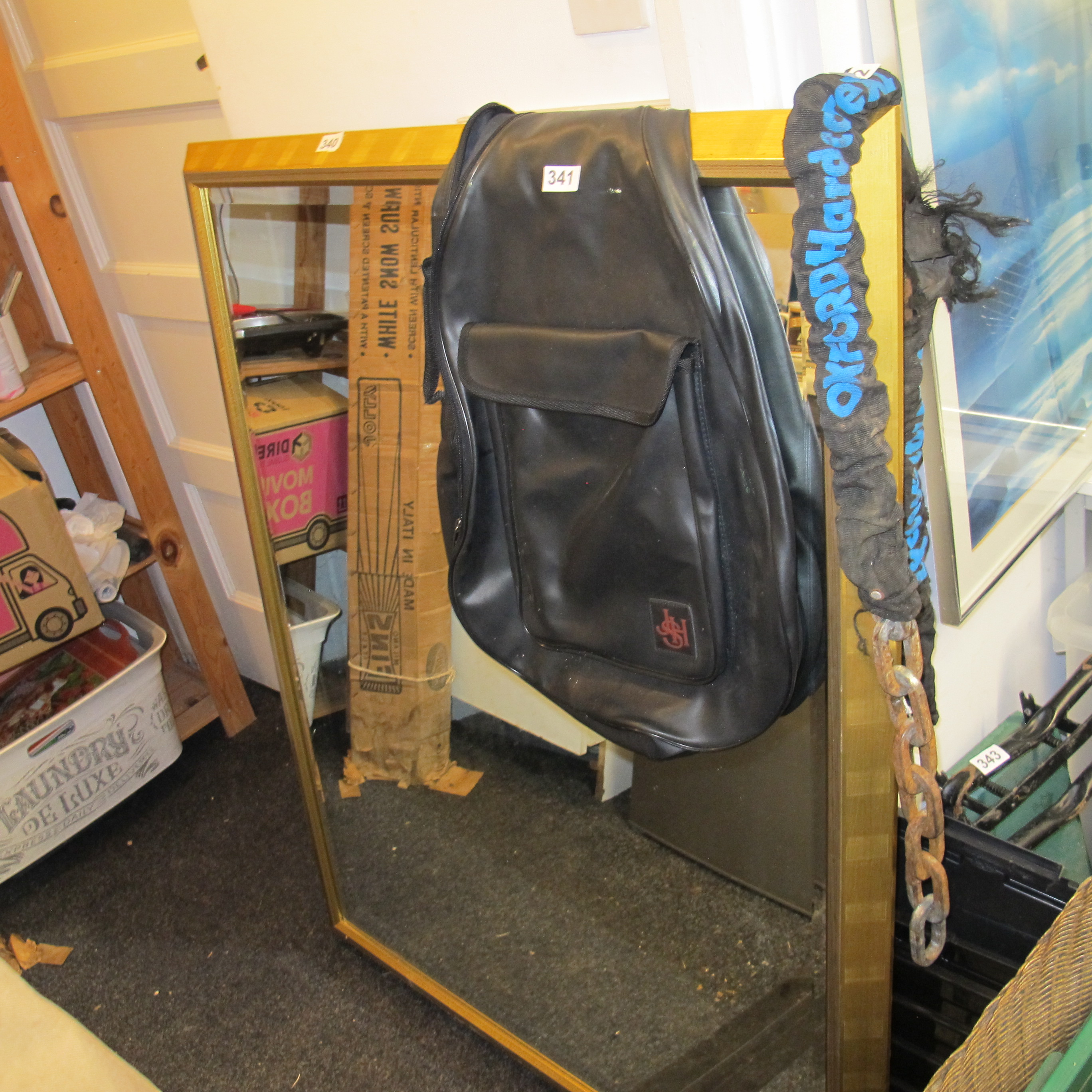 Three Items Comprising a Wall Mirror, a Backpack, and a Security Chain