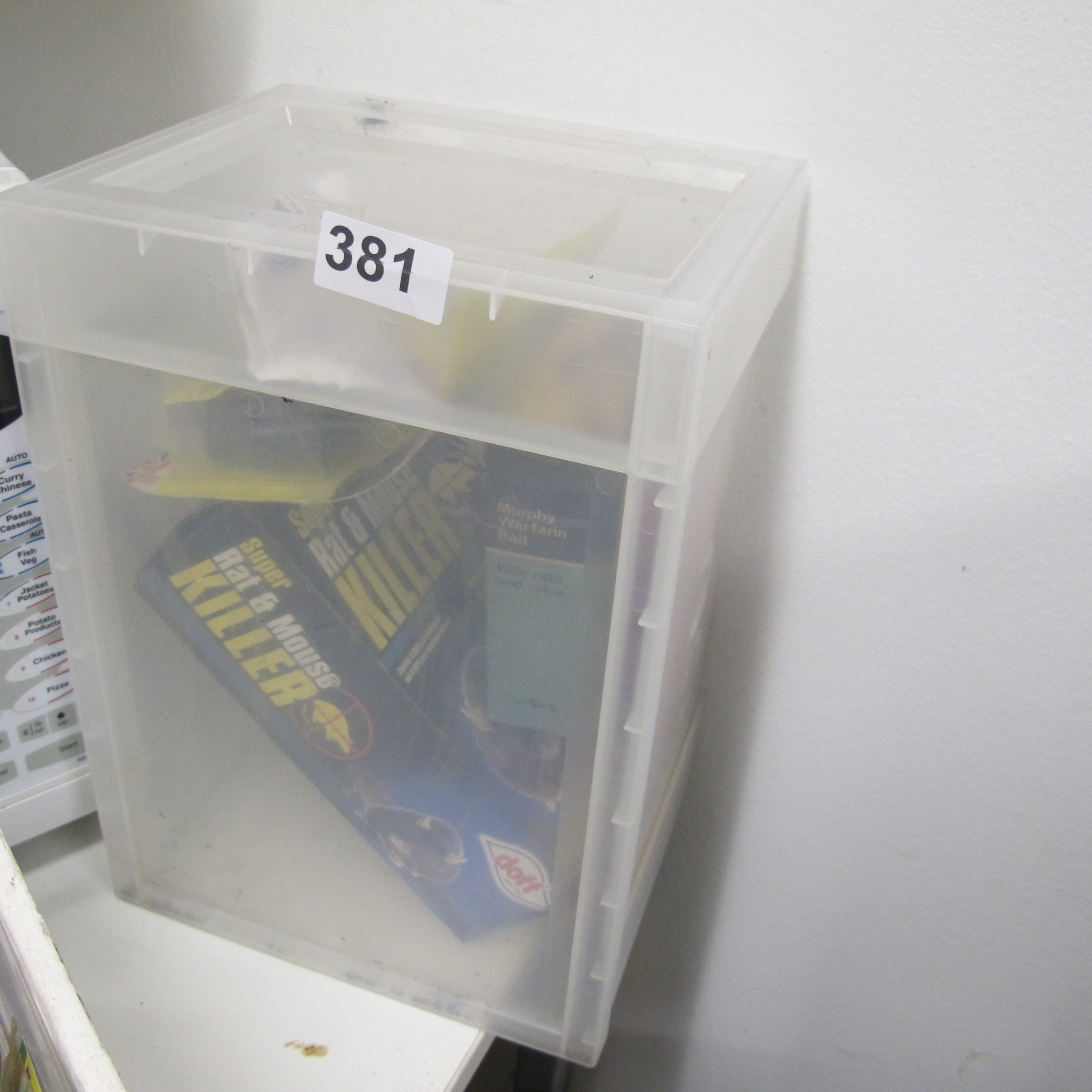 An IRIS USA Plastic Storage Bin Containing a Collection of Rodenticides