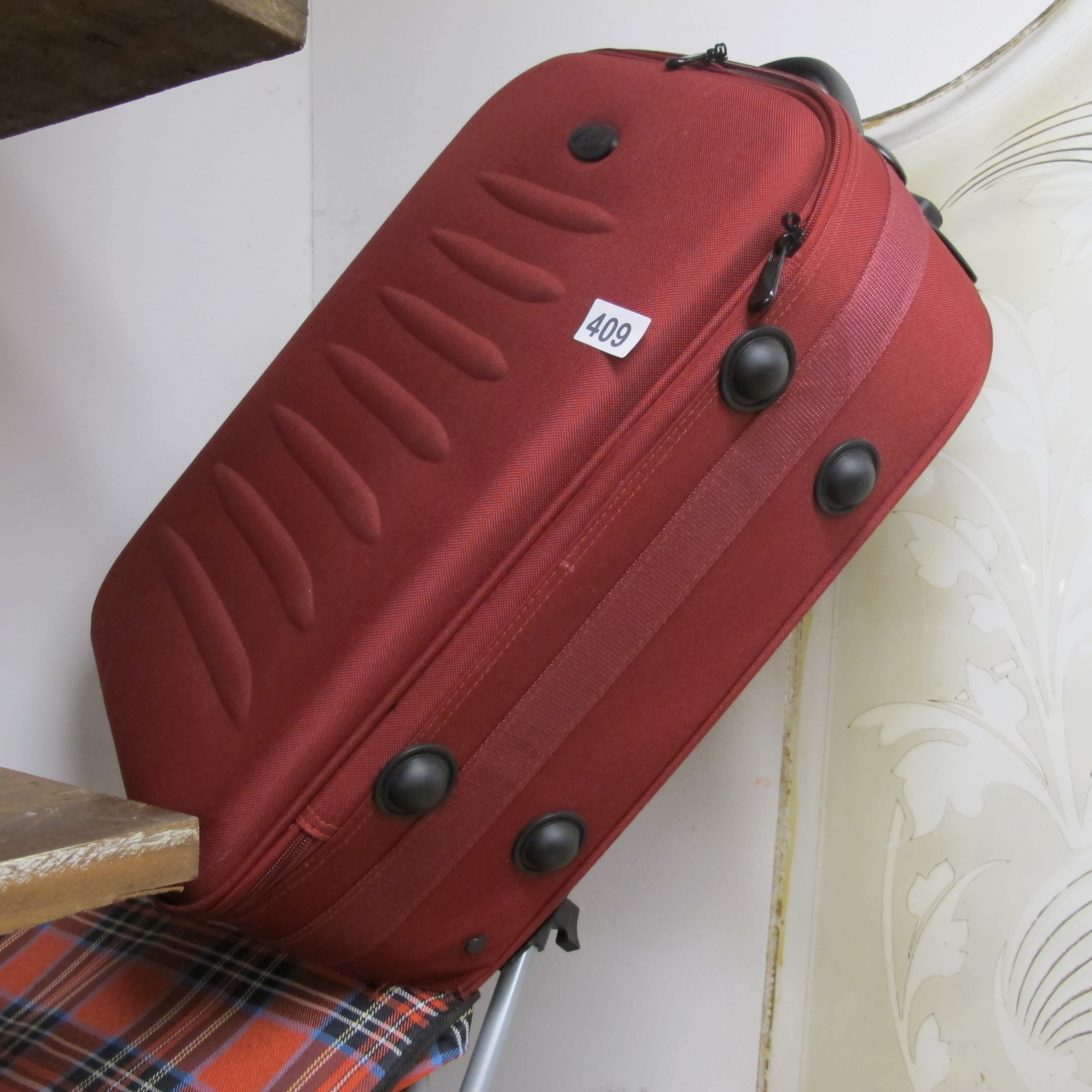 A Modern Red Synthetic Fabric Rolling Suitcase