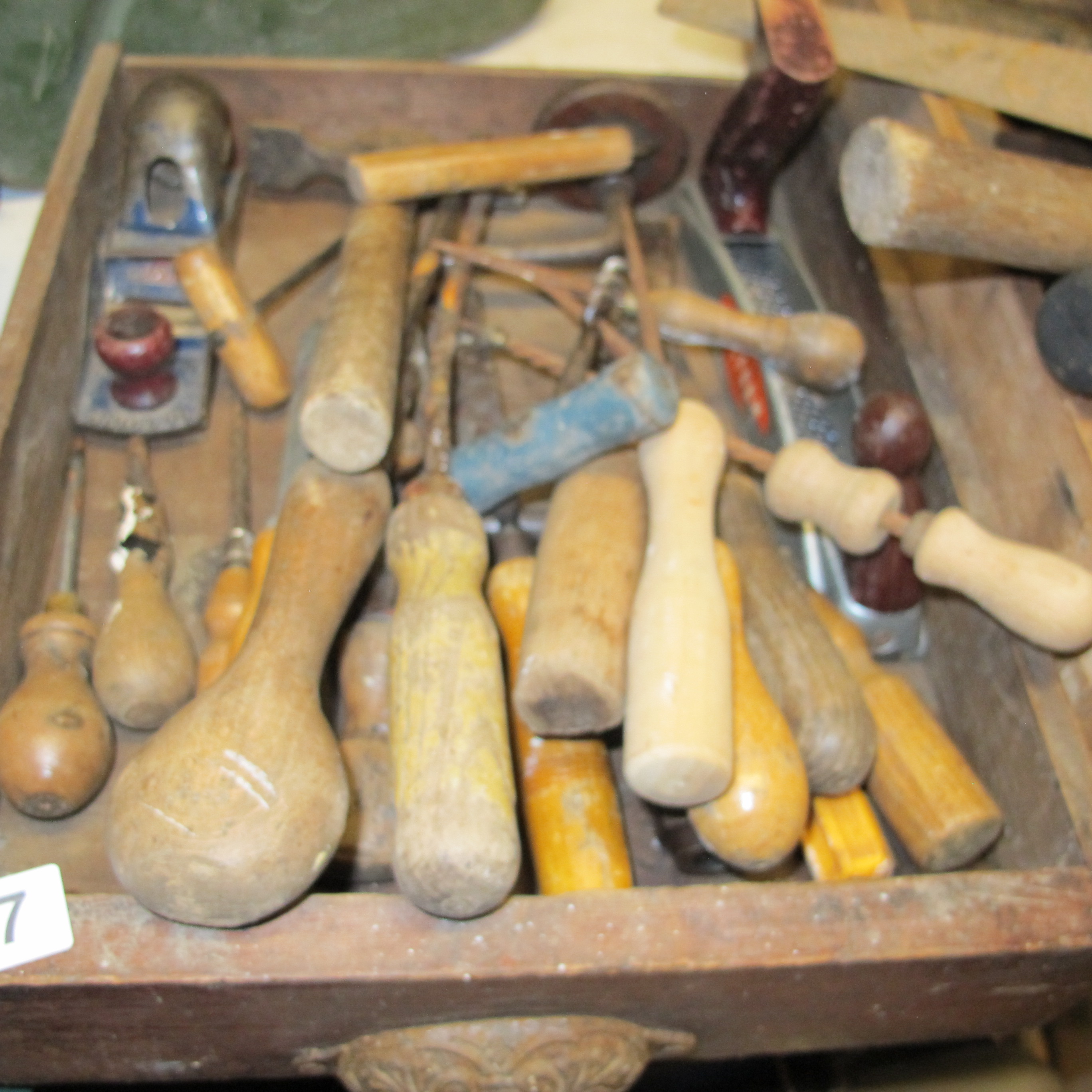 An Assortment of Vintage Hand Tools in a Wooden Drawer