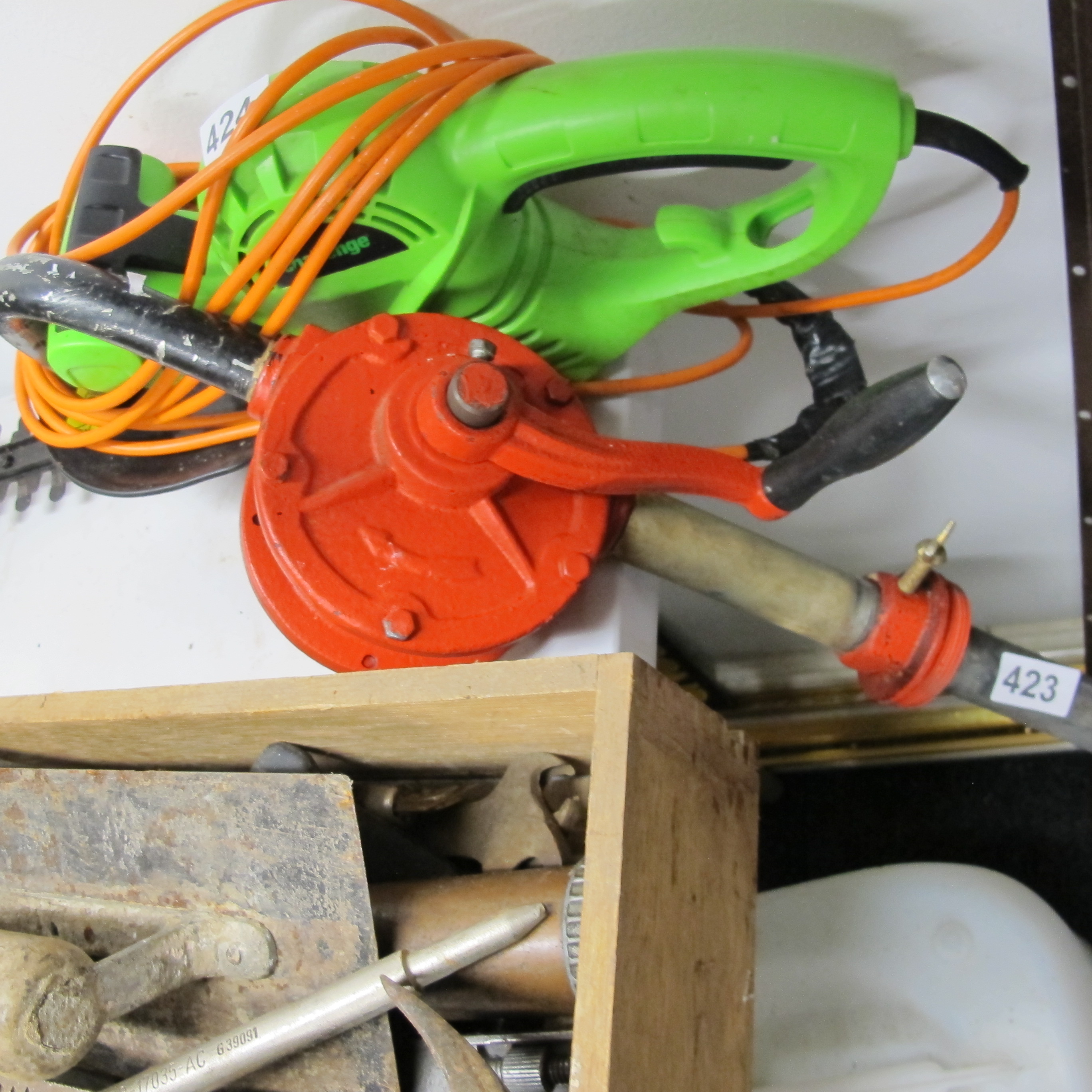 A Collection of Power and Hand Tools including a Challenge Hedge Trimmer and a Rotary Barrel Pump