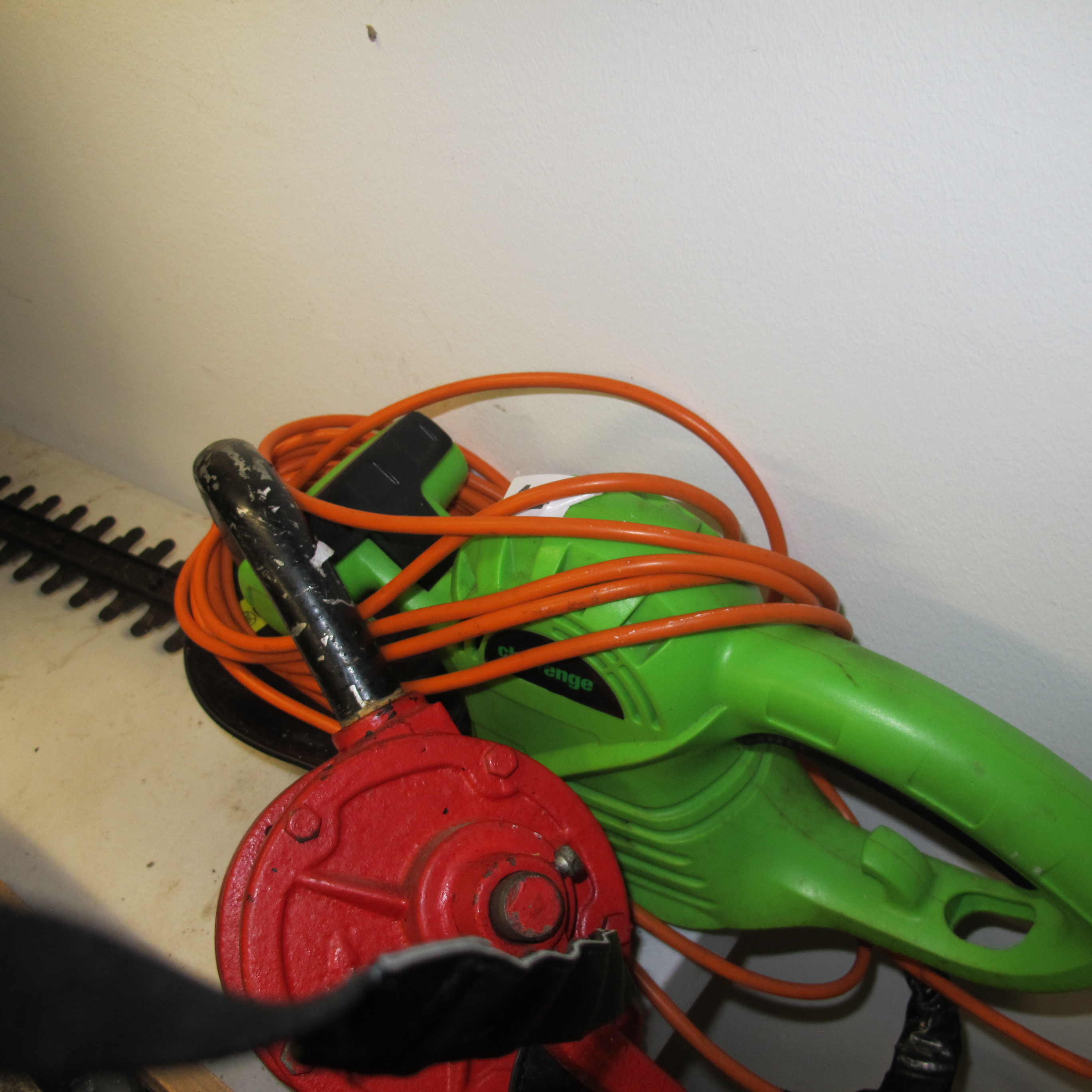 Two Garden Tools Including a Challenge Electric Hedge Trimmer and a Manual Hand-Crank Device