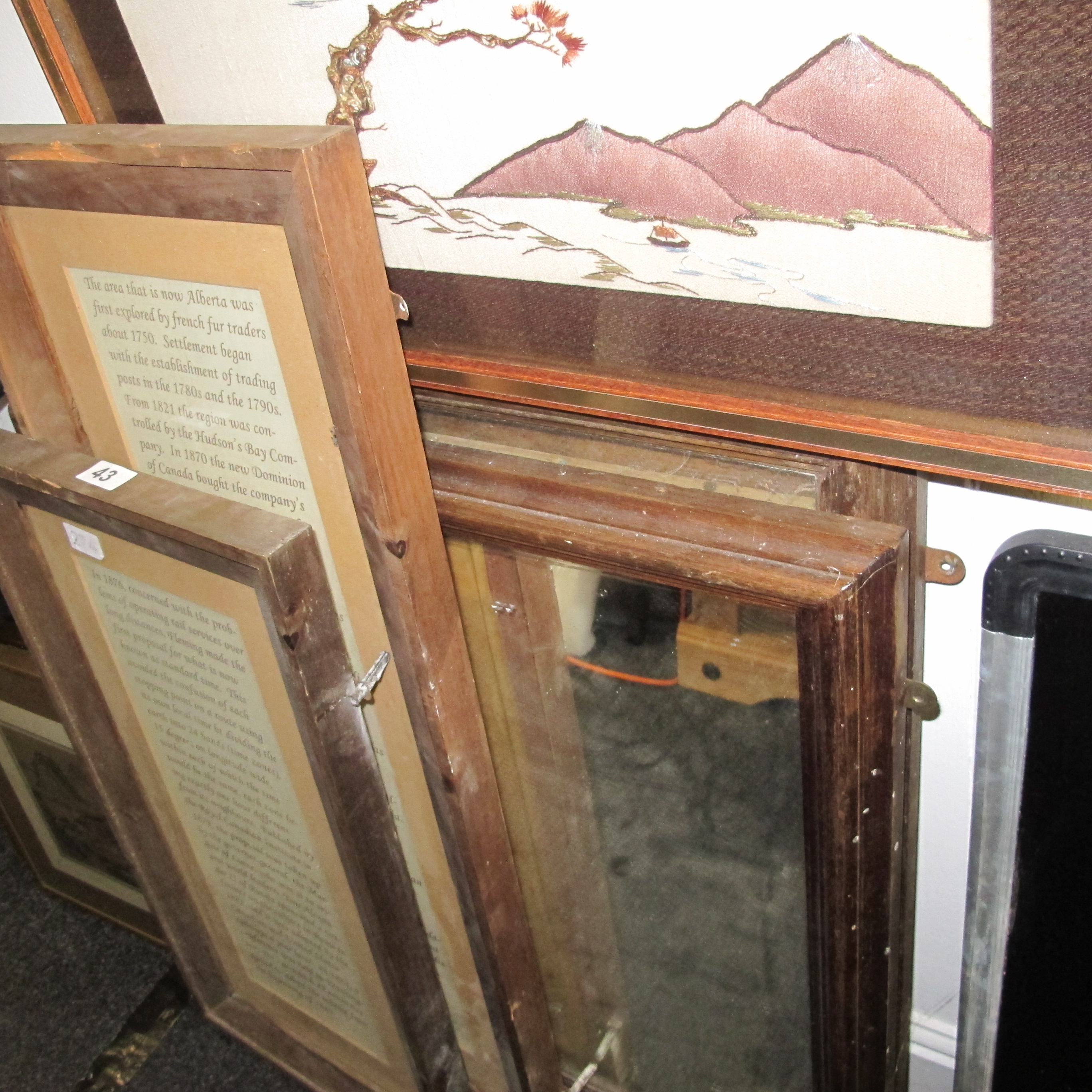 A Collection of Framed Items Including an Embroidered Landscape, Historical Placards, and a Mirror