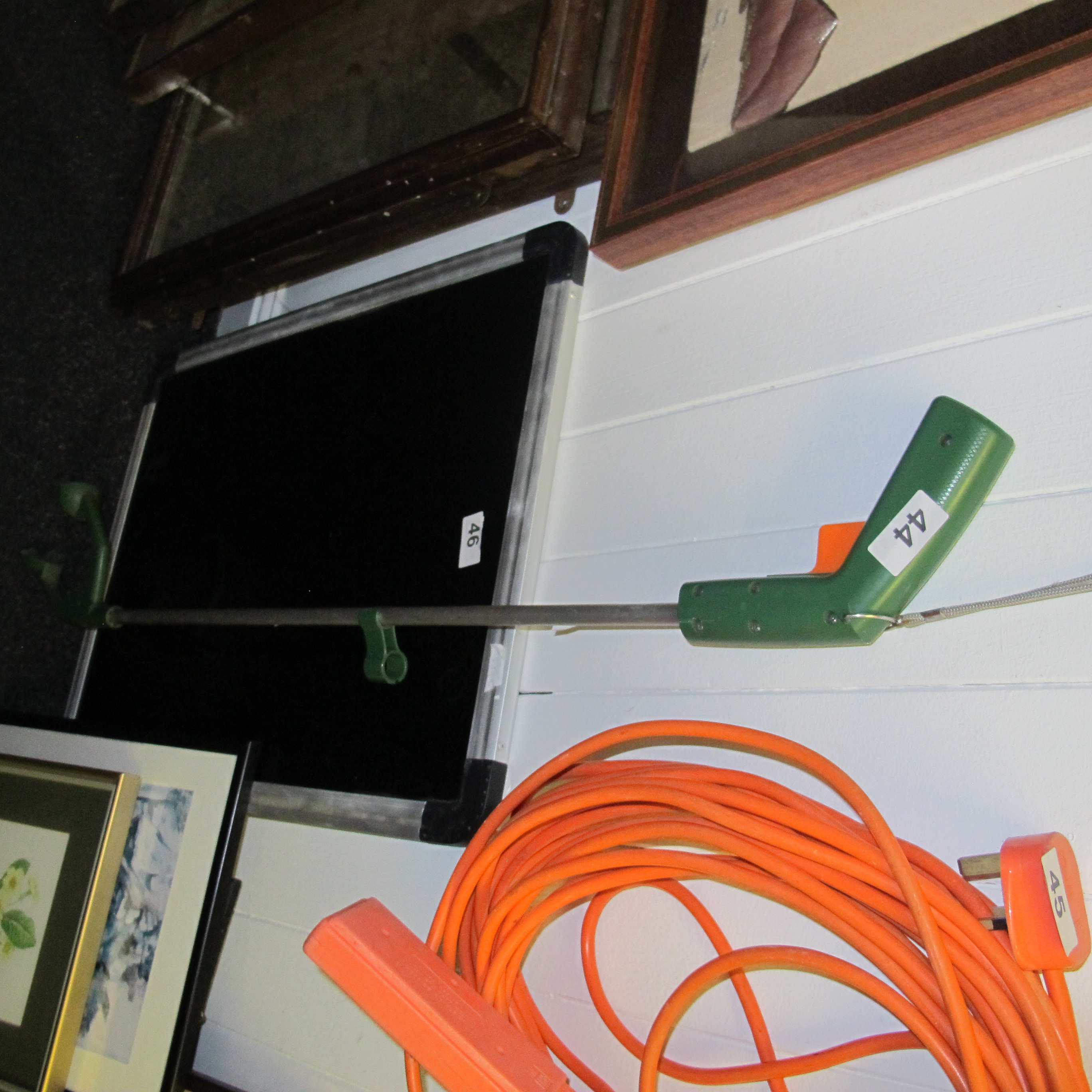 A Collection of Household and Garden Equipment including an Electric Thermal Weed Burner, Extension Cord, and Framed Panel