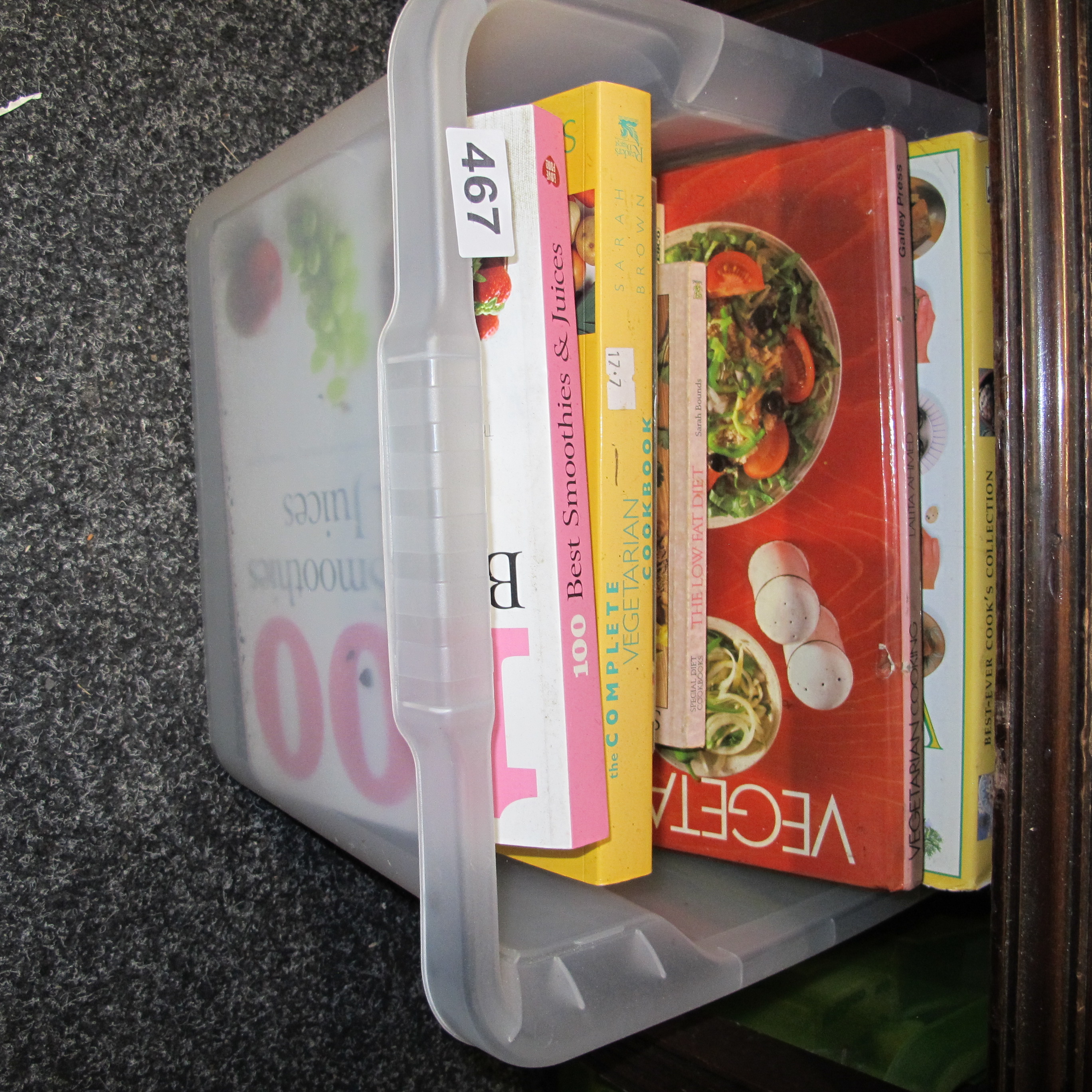 A Collection of Contemporary Cookbooks and a Plastic Food Storage Container