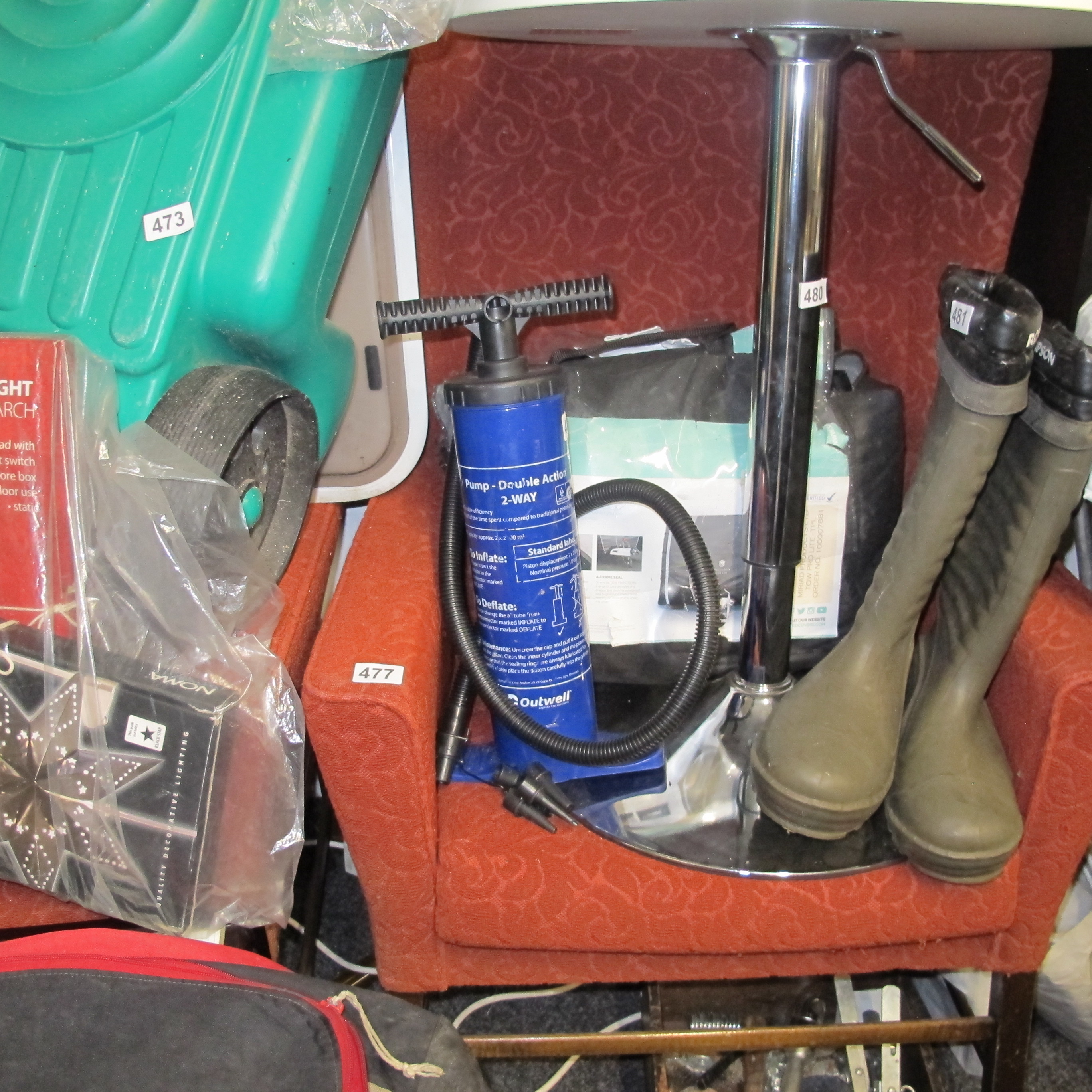 An Assortment of Household and Outdoor Goods Including an Outwell Double Action Pump