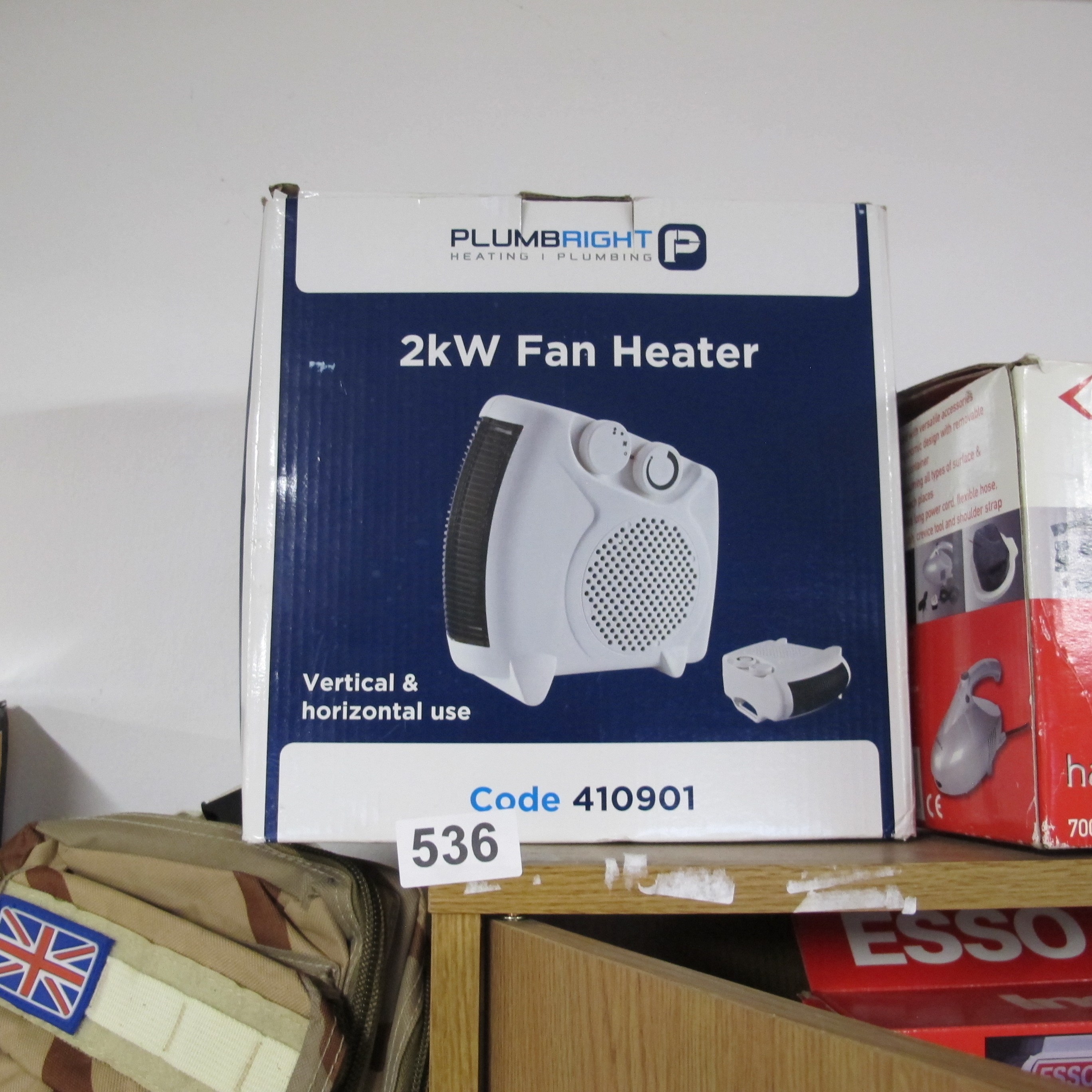 A Collection of Household Items Including a Plumbright 2kW Fan Heater