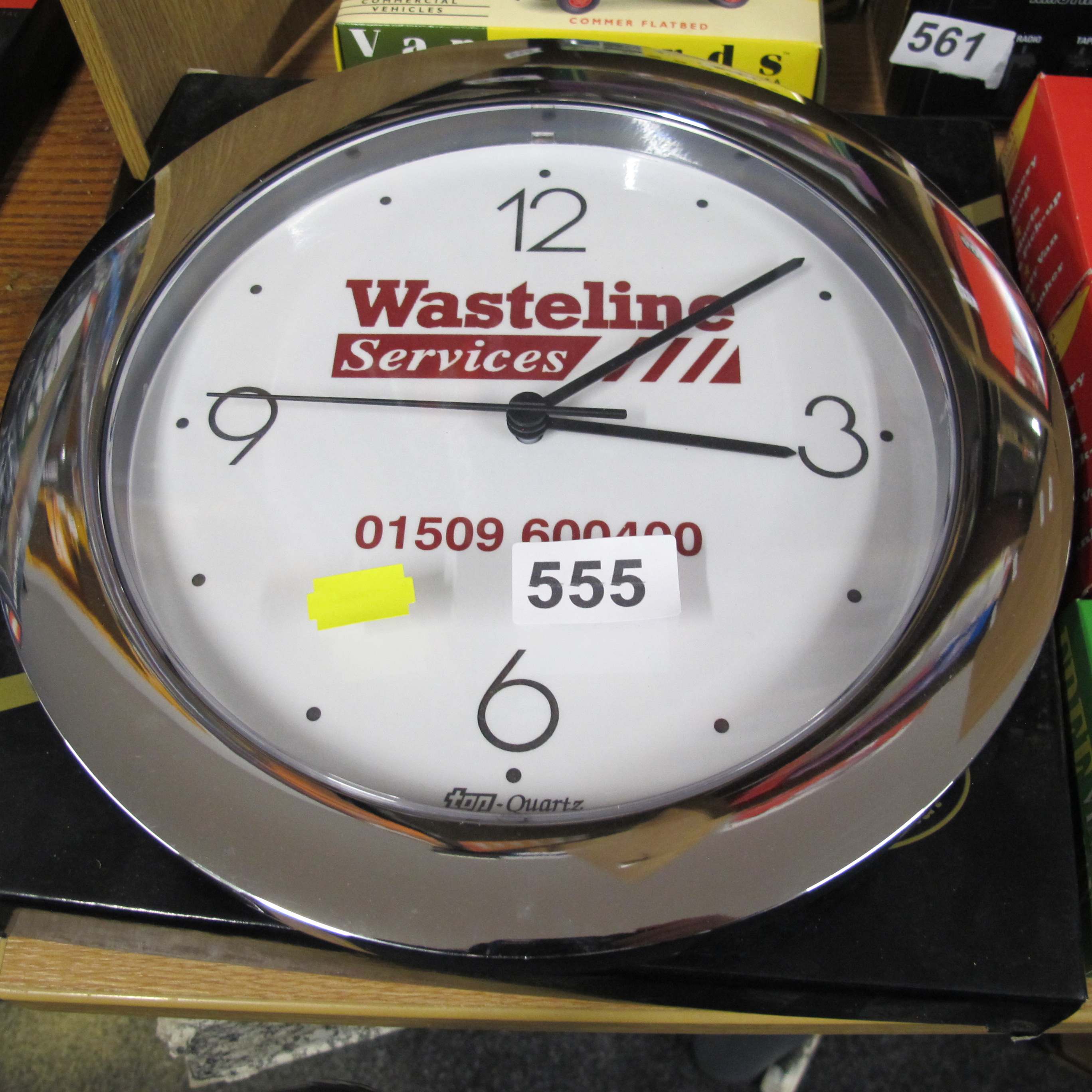 A Contemporary Chrome-Finished Promotional Wall Clock for Wasteline Services