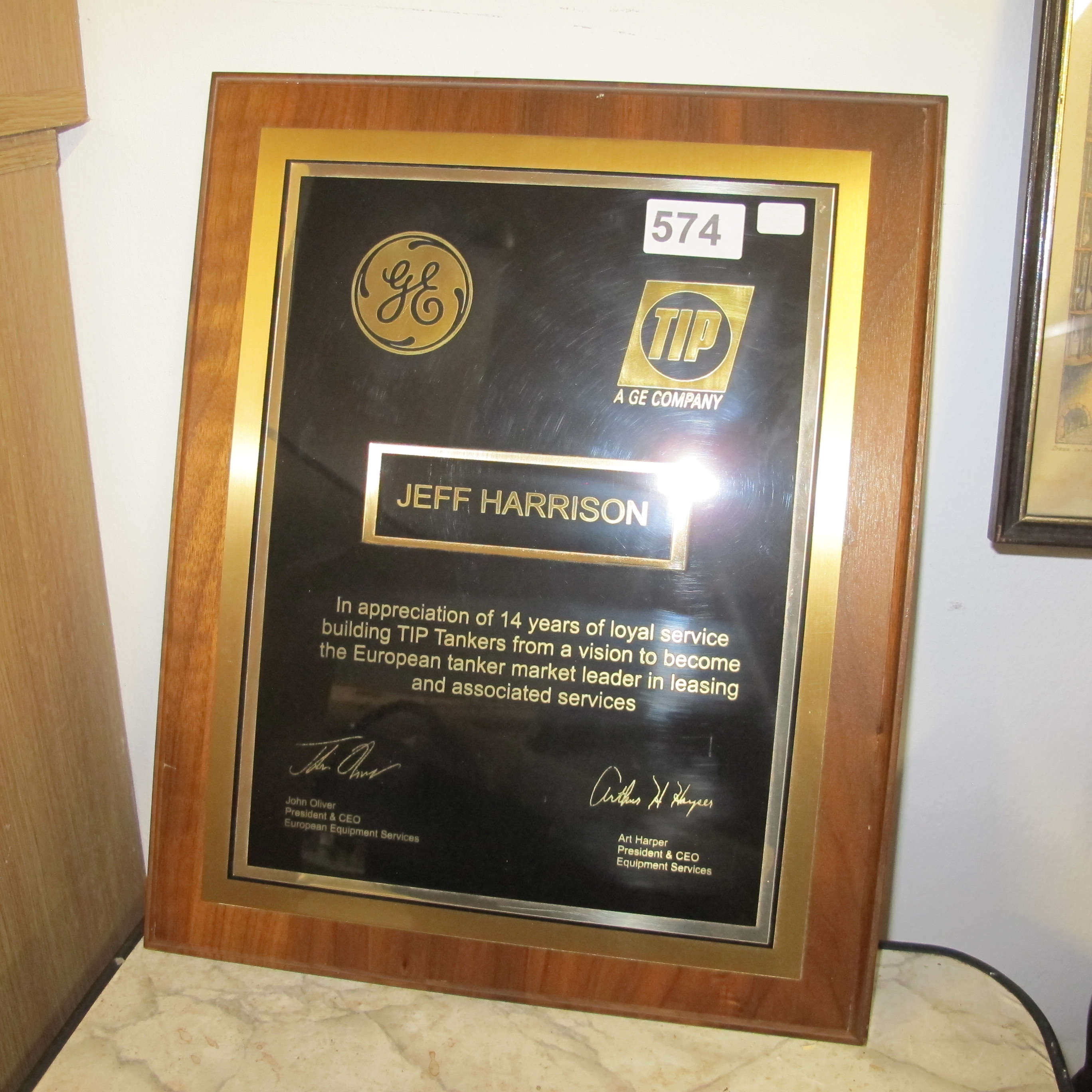 A GE and TIP Corporate Commemorative Service Award Plaque for Jeff Harrison