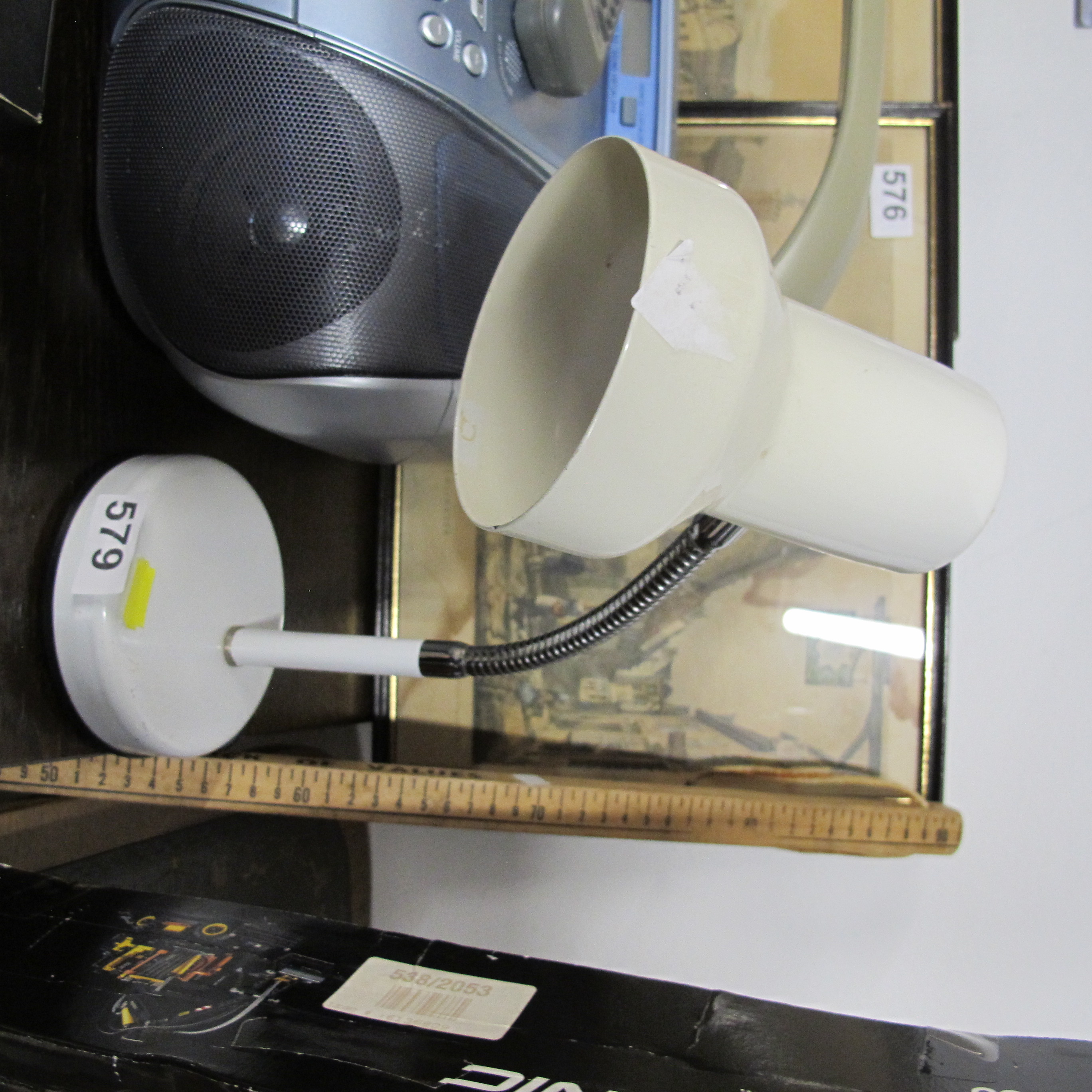 An Assortment of Household Items Including a Gooseneck Desk Lamp and Portable Radio