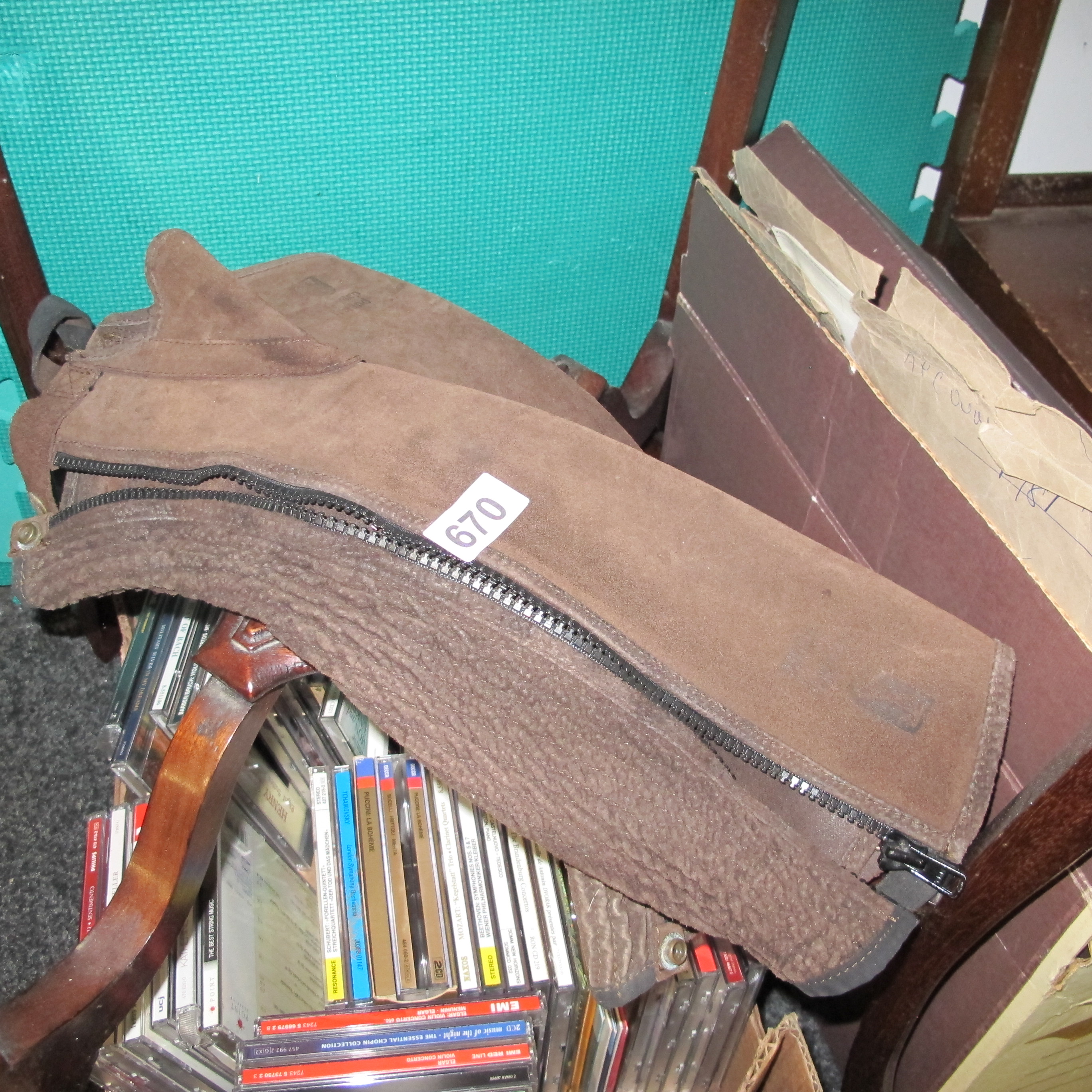 A Pair of Brown Suede Equestrian Half-Chaps and a Collection of Classical Music CDs