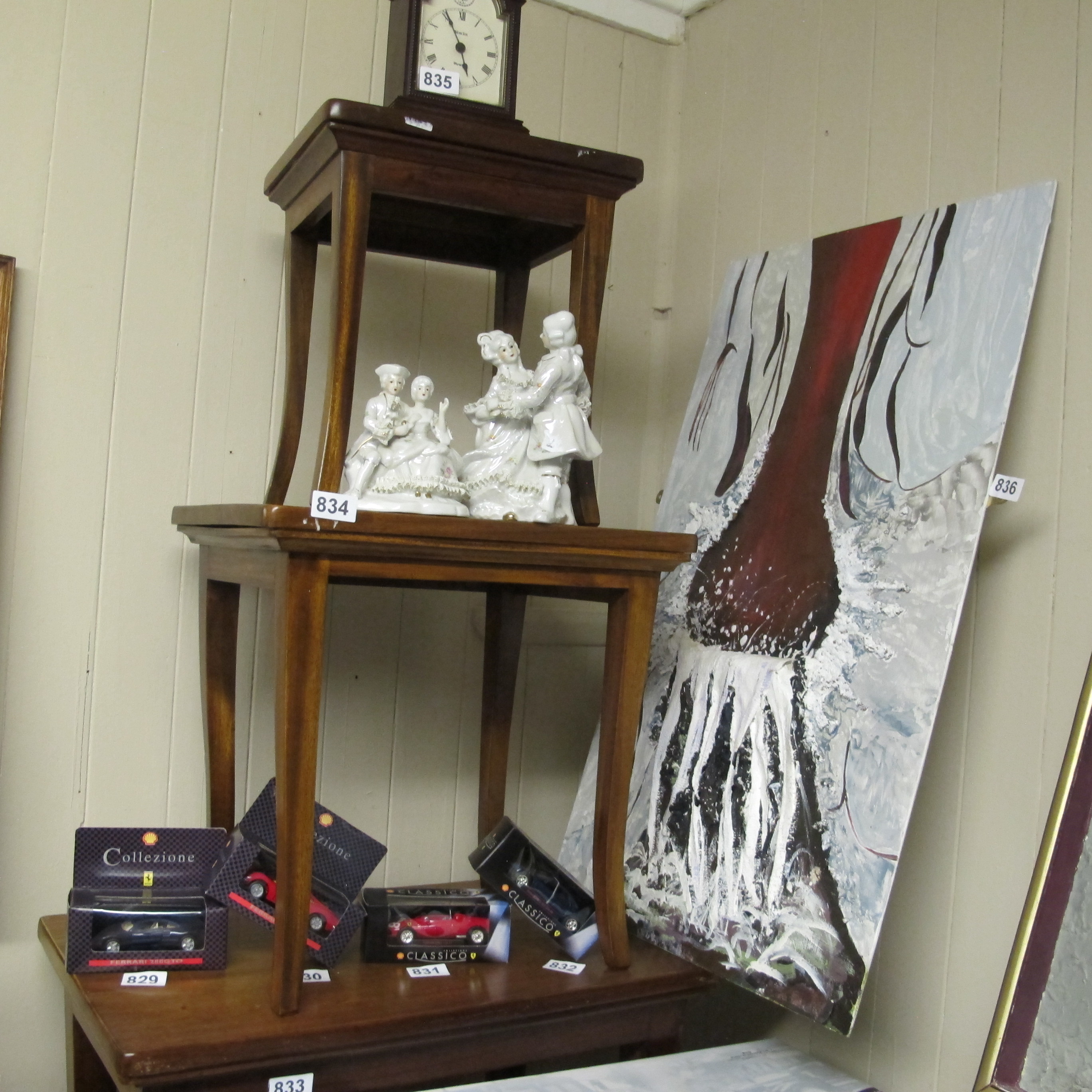 An Assortment of Furniture, Decorative Objects, and Art including Side Tables, Porcelain Figurines, a Mantel Clock, Die-Cast Model Cars, and an Abstract Painting