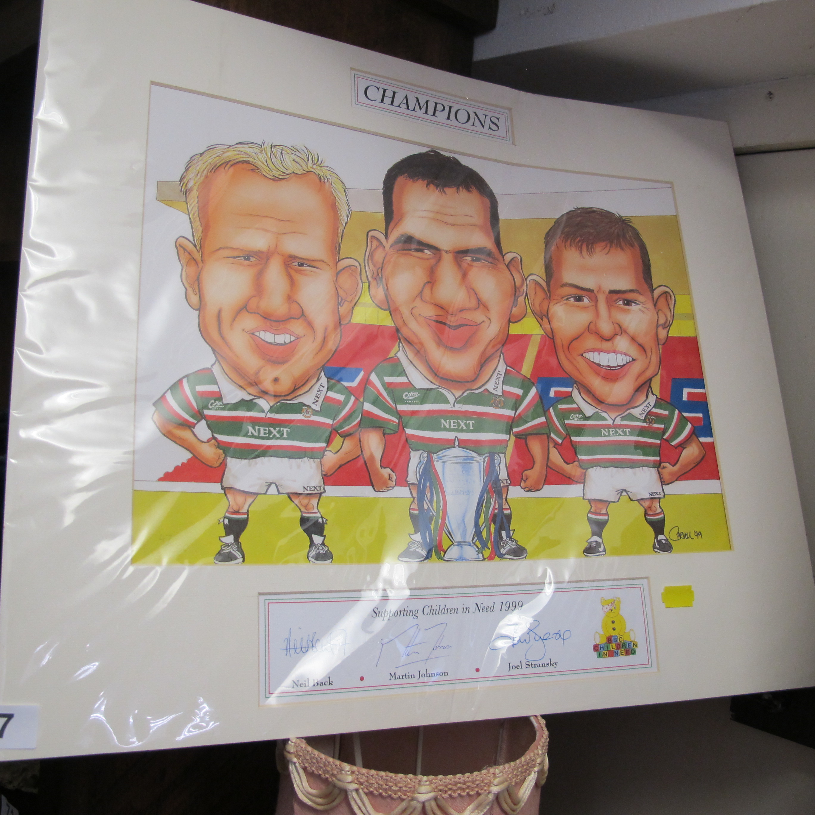 A Signed 1999 Leicester Tigers Rugby Caricature Print Featuring Neil Back, Martin Johnson, and Joel Stransky