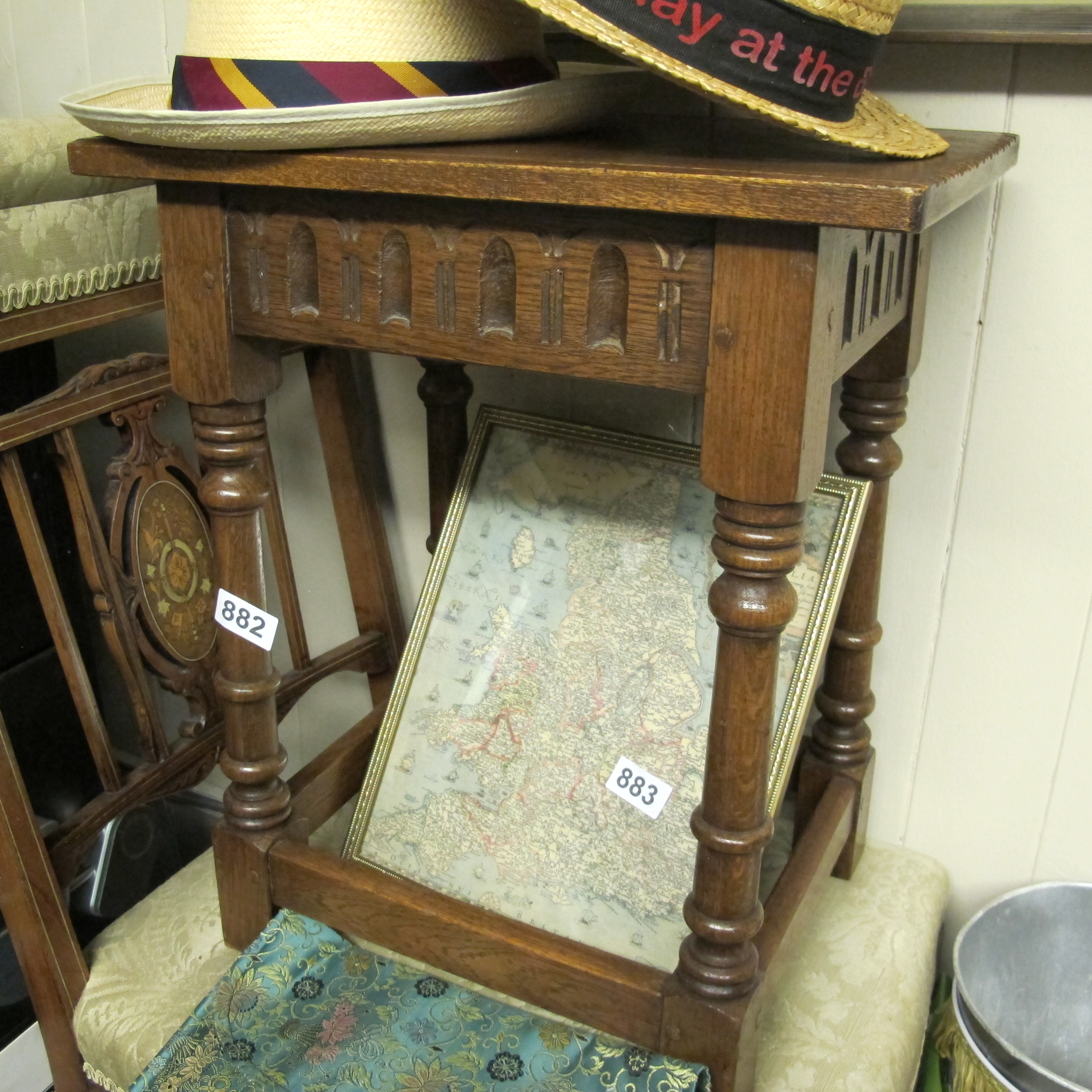 A Collection of Items Including a Gothic Style Oak Occasional Table and a Framed Map