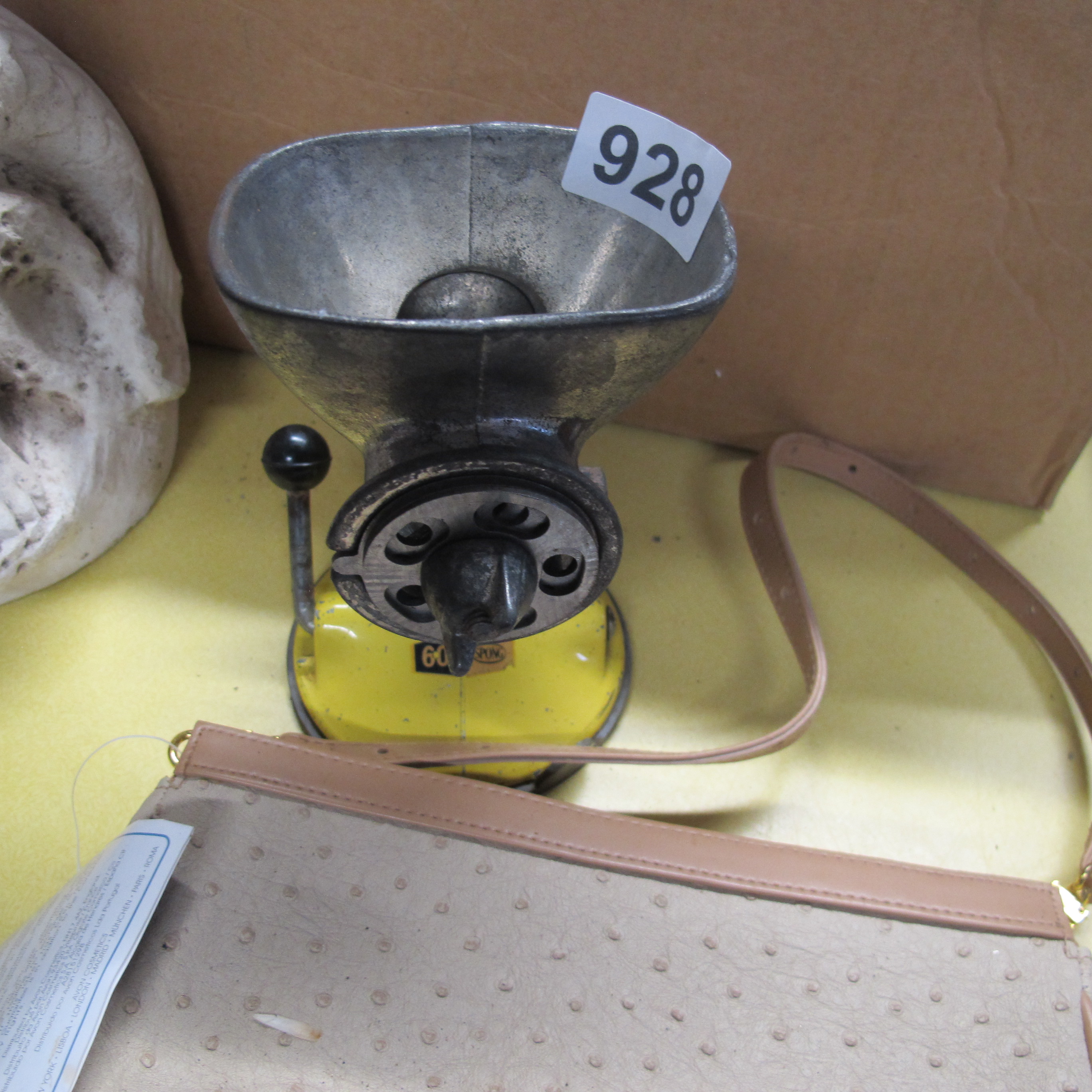 Spong and Co. Model 601 Manual Food Mincer with Ostrich-Embossed Handbag and Sculpture, circa 1960s