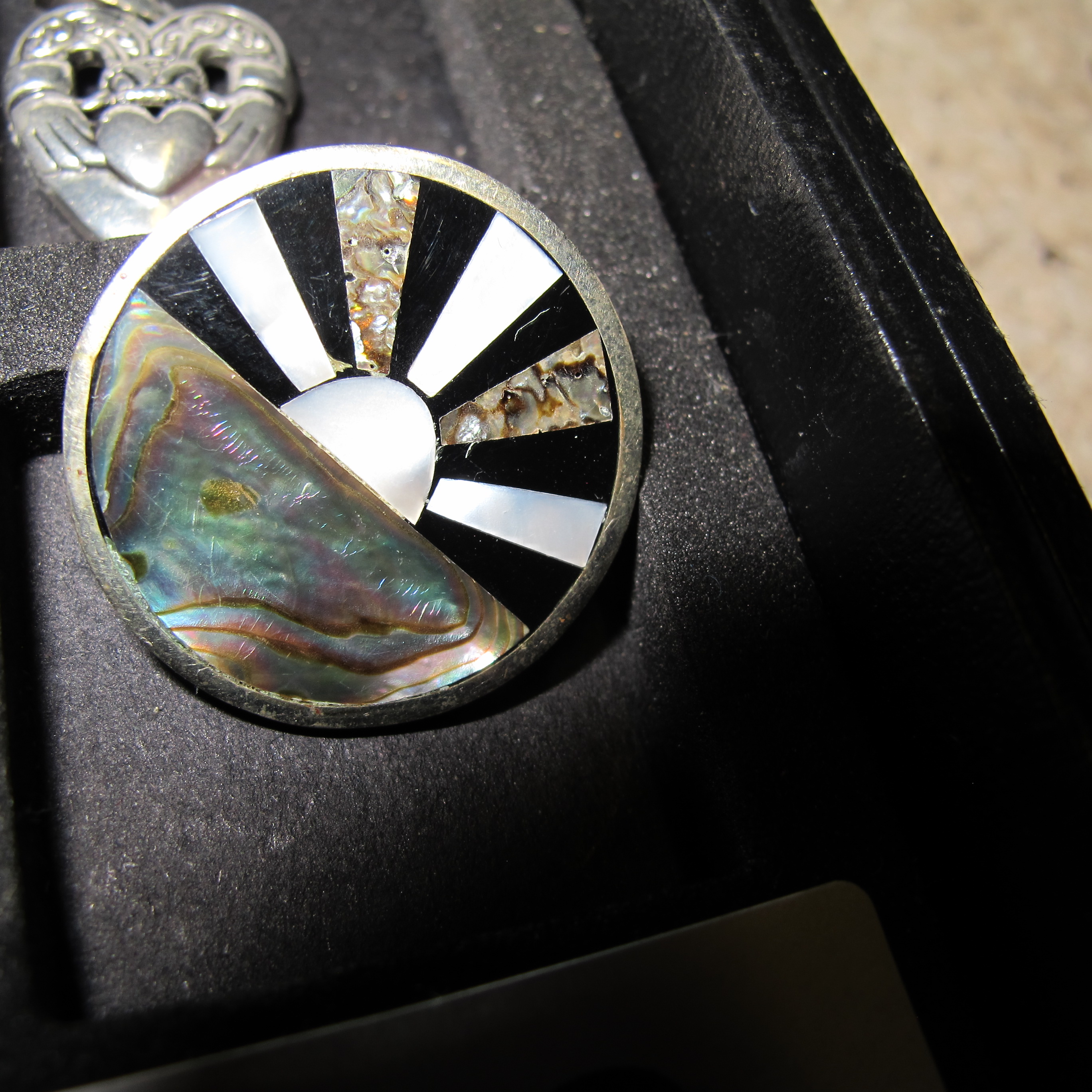 Two brooches including a Mexican style circular abalone and mother-of-pearl inlay landscape brooch