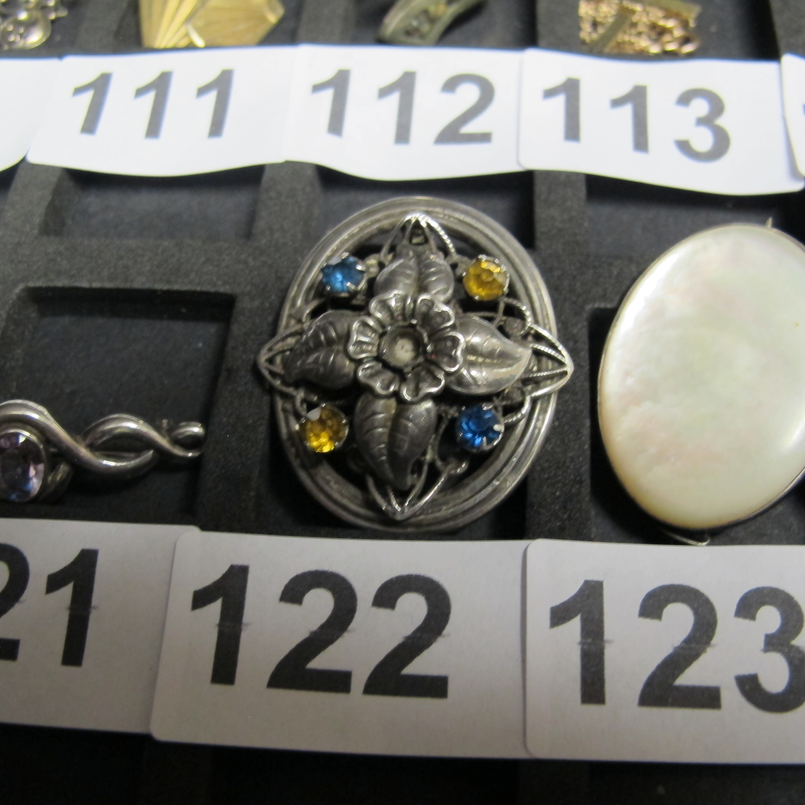 A Trio of Silver-Toned Brooches including Floral and Mother-of-Pearl Examples