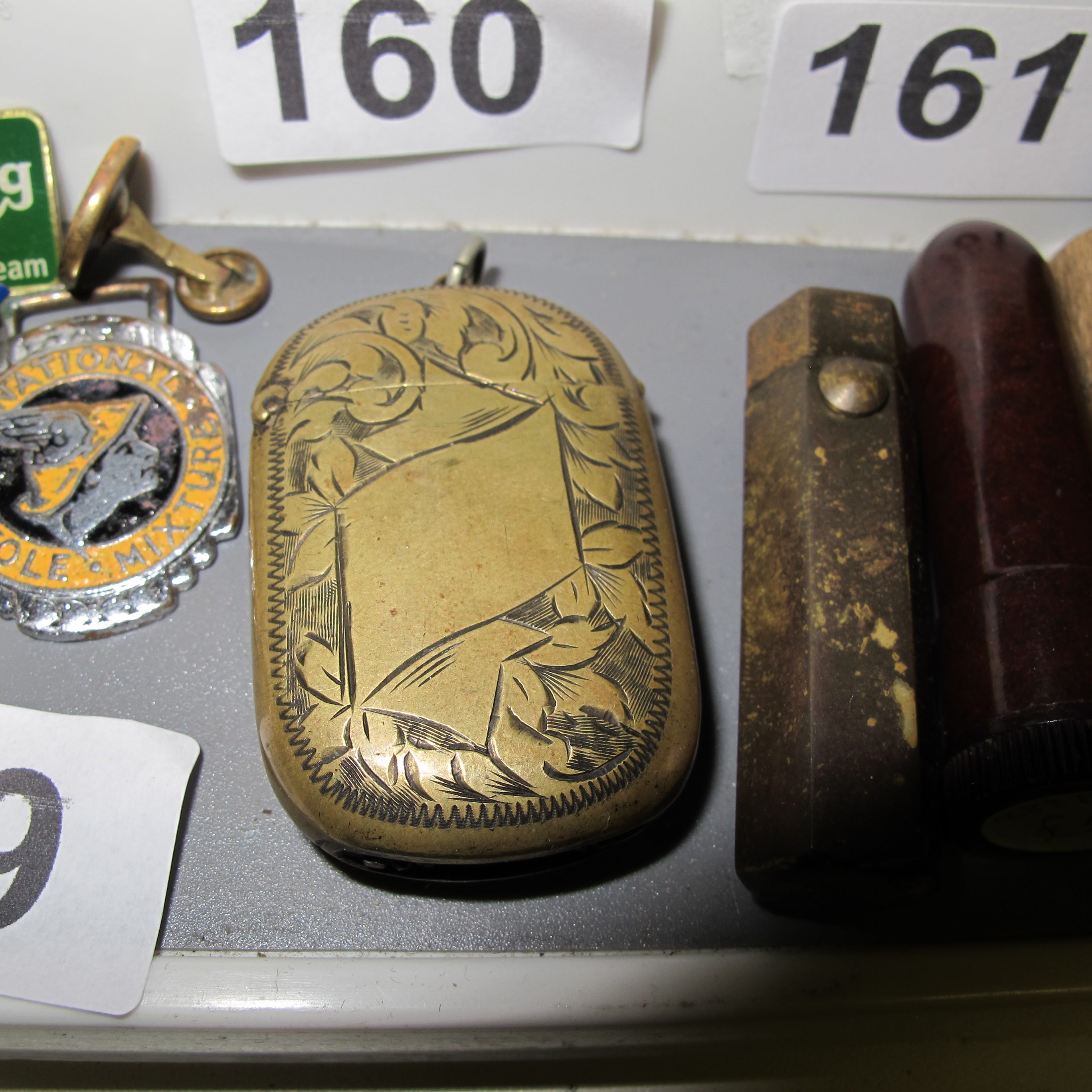 A Collection of Vintage Personal Accessories and Writing Instruments including a Brass Vesta Case and National Benzole Mixture Badge