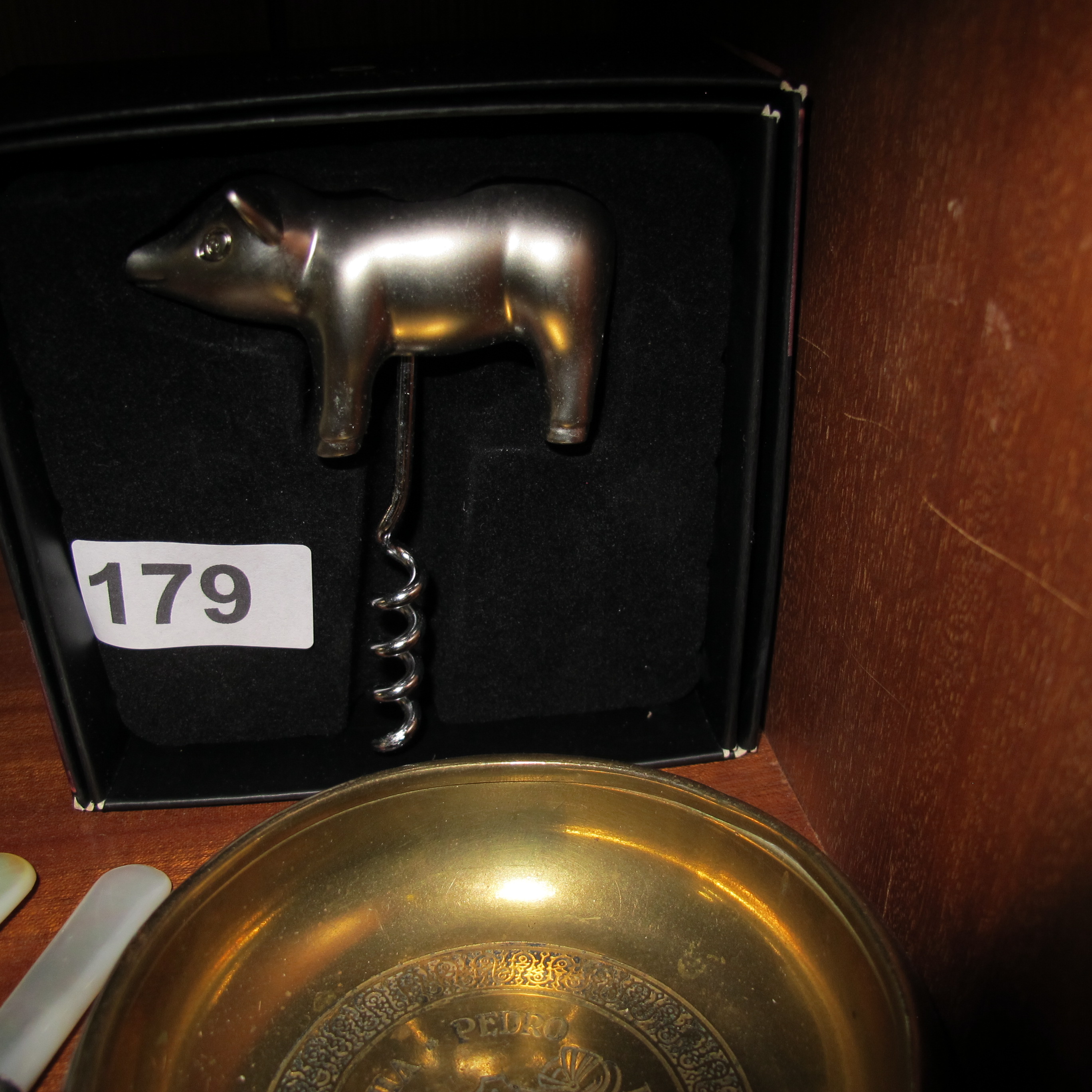 An Assortment of Collectables including a Chrome Novelty Pig Corkscrew and a Brass Dish