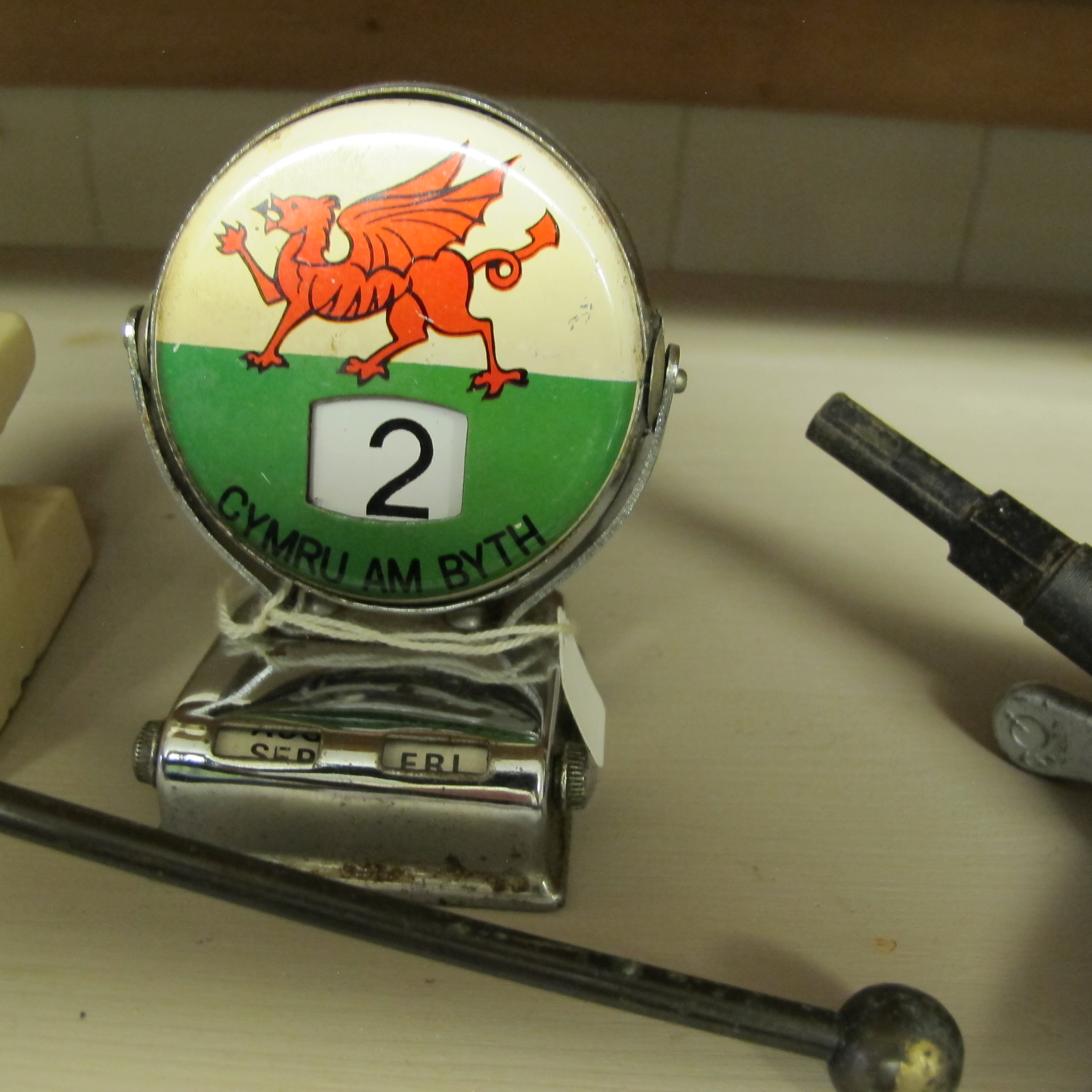 A Mid-20th Century Welsh Cymru Am Byth Perpetual Desk Calendar Incorporating a Car Grille Badge Style Emblem