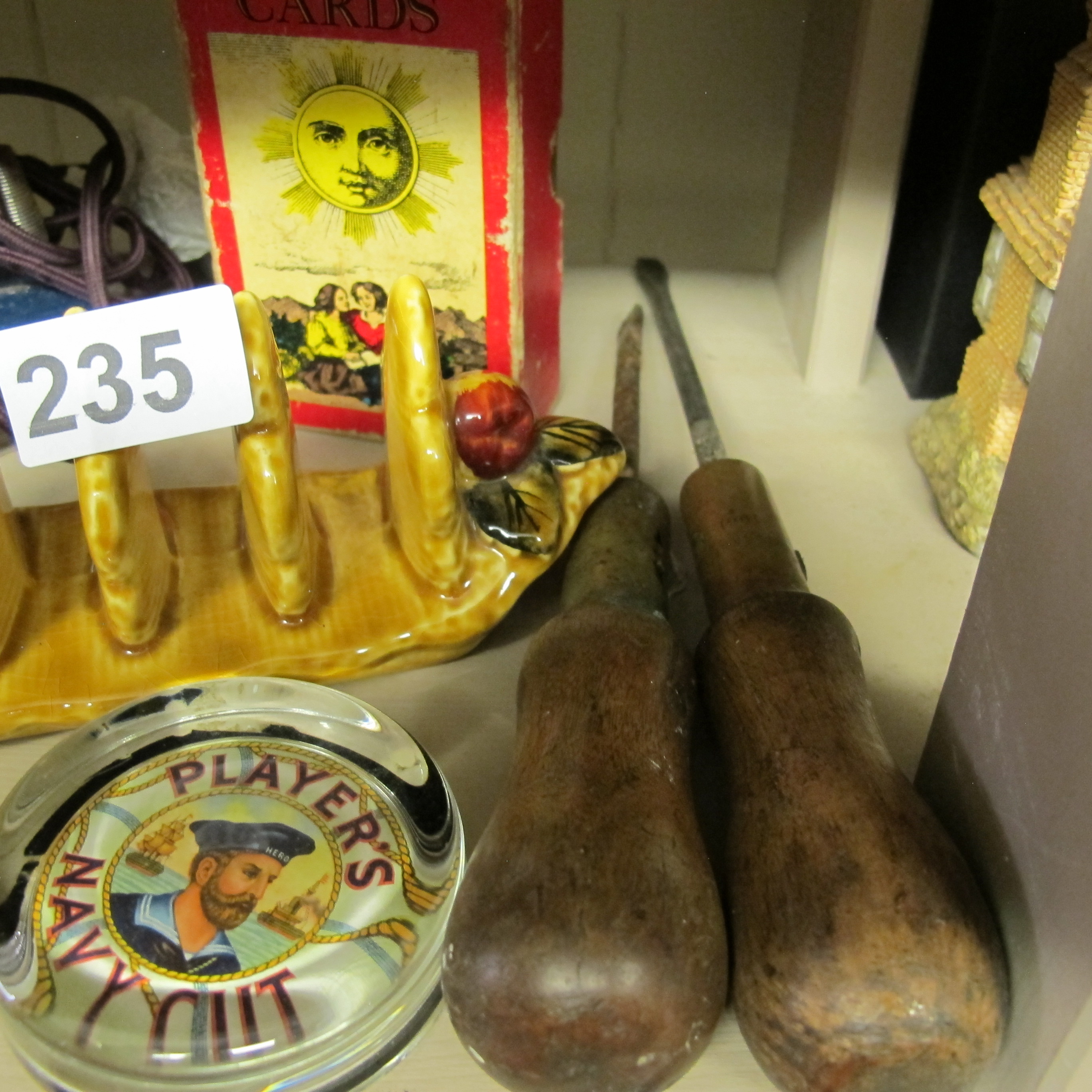 An Assortment of Vintage British Collectibles Including Hand Tools, Advertising Glassware, and a Ceramic Toast Rack