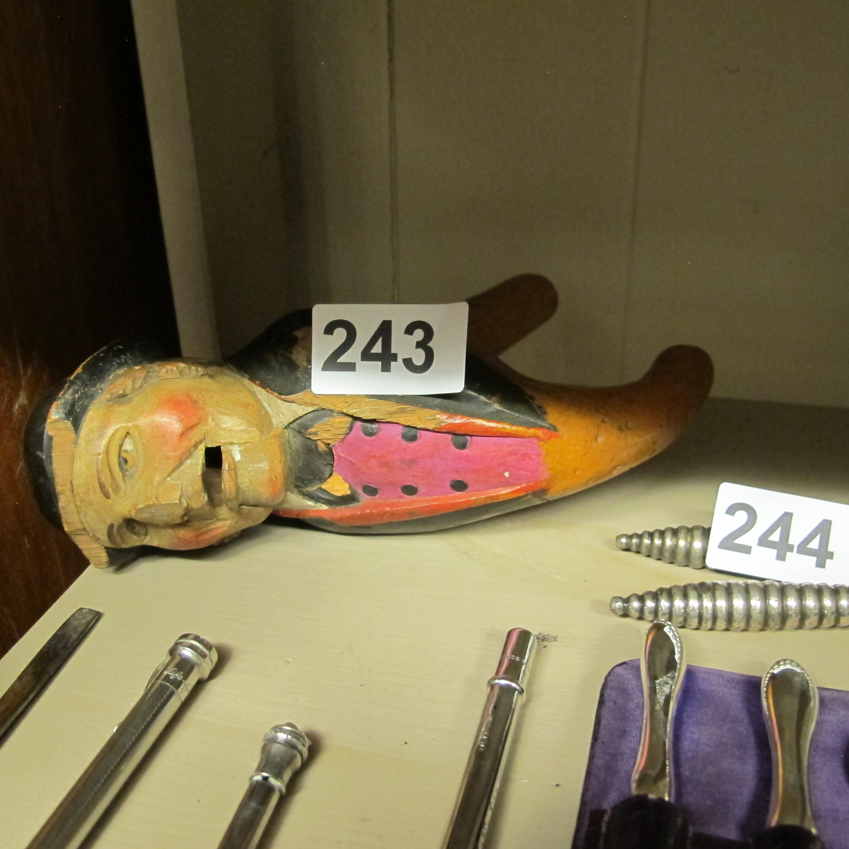 A Collection of Silver and Silver-Plated Items Including a Carved Wooden Nutcracker and Specialised Metal Tools