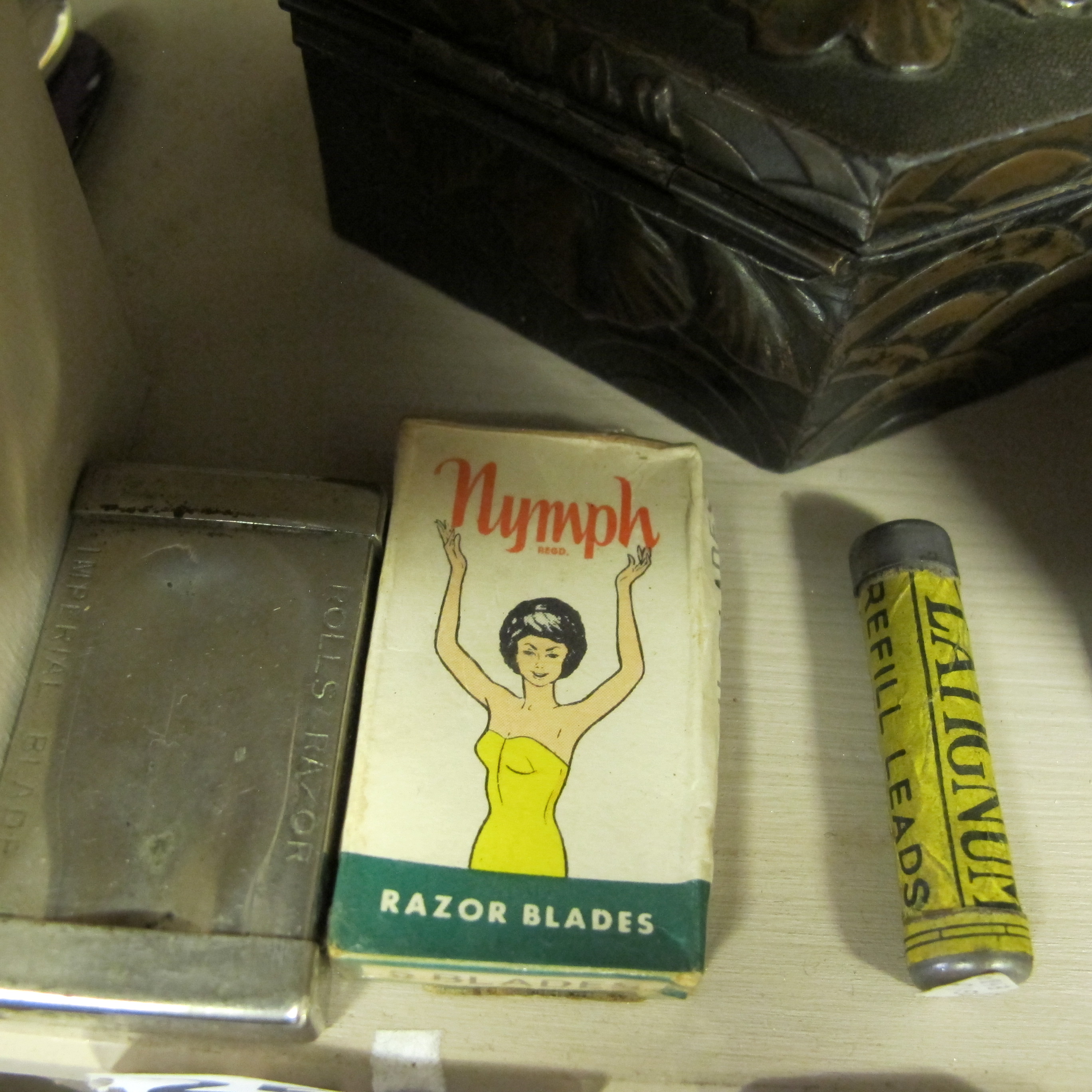 An Assortment of Vintage Personal Grooming and Stationery Items including Rolls Razor and Nymph Razor Blades