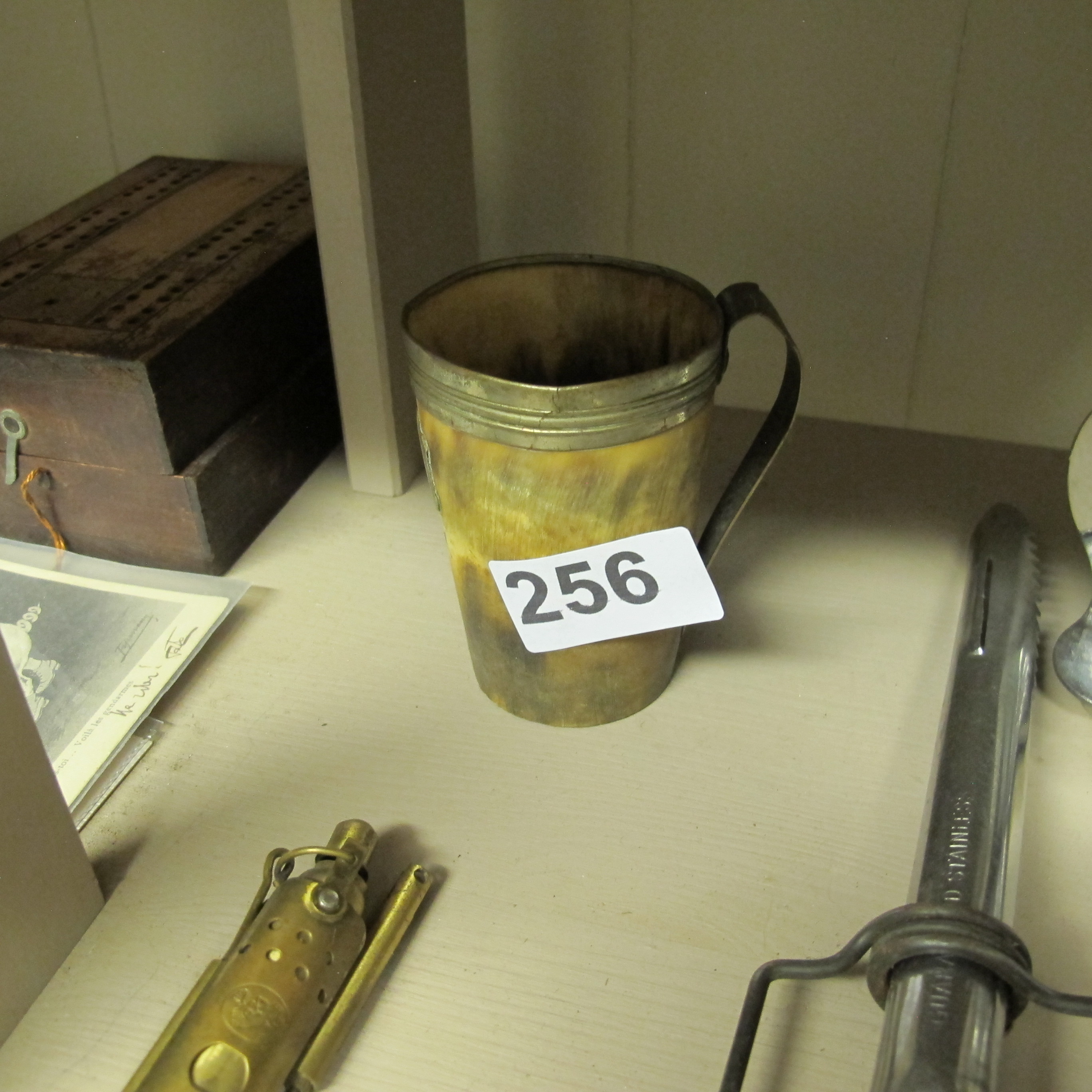 A Collection of Antique and Vintage Items Including a Horn Mug, Wooden Boxes, and Brass Ware