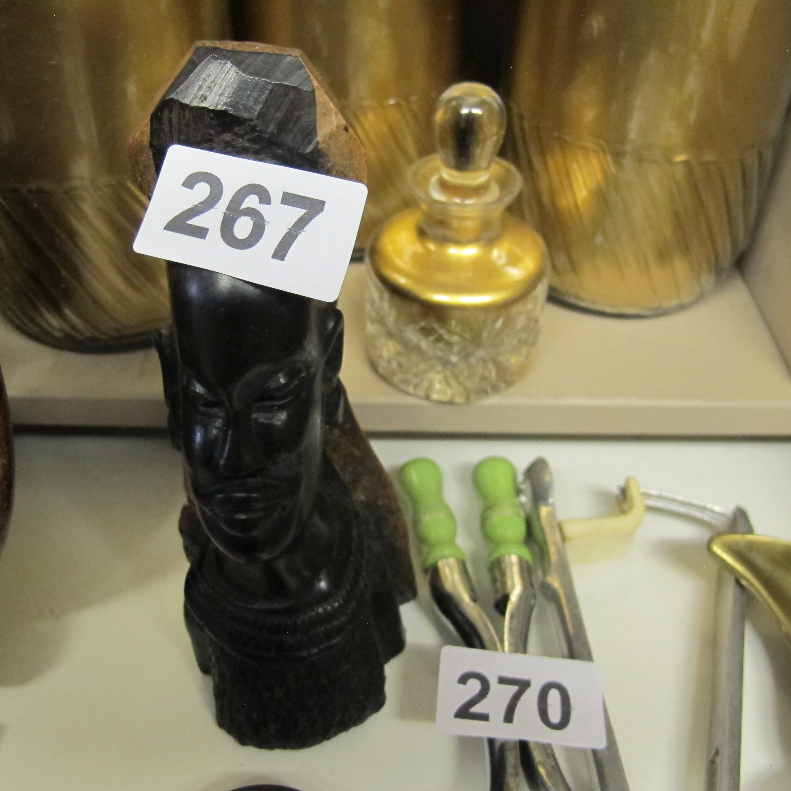 An Assortment of Decorative Items including an African Carved Ebony Style Bust, Glassware, and Utensils