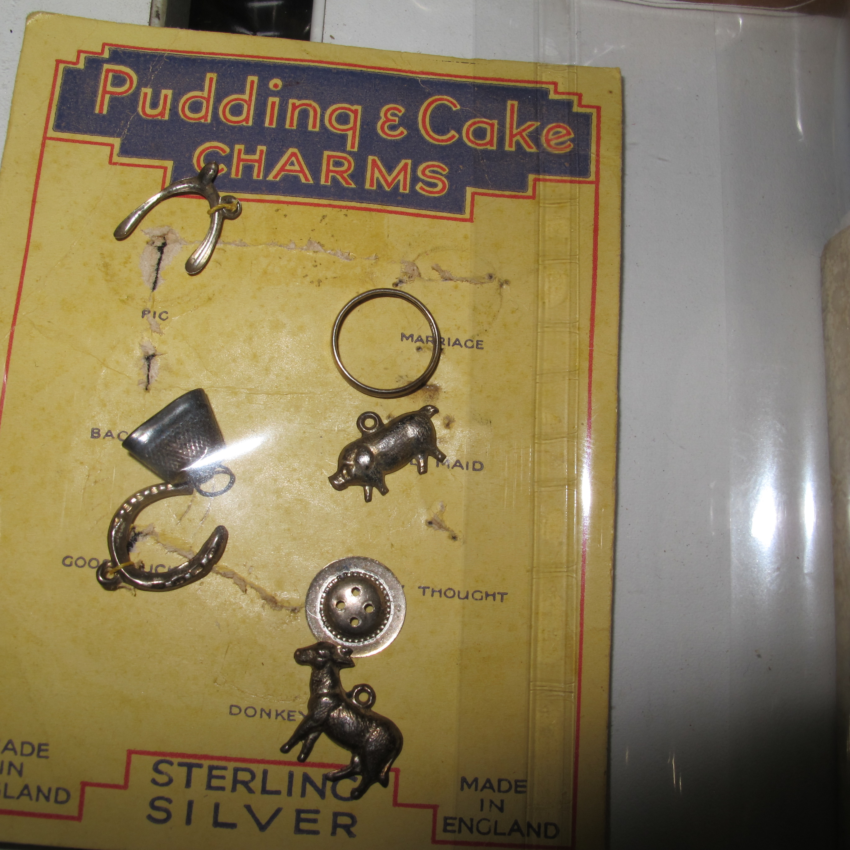 A Set of Seven Sterling Silver Christmas Pudding and Cake Charms on Original Display Card