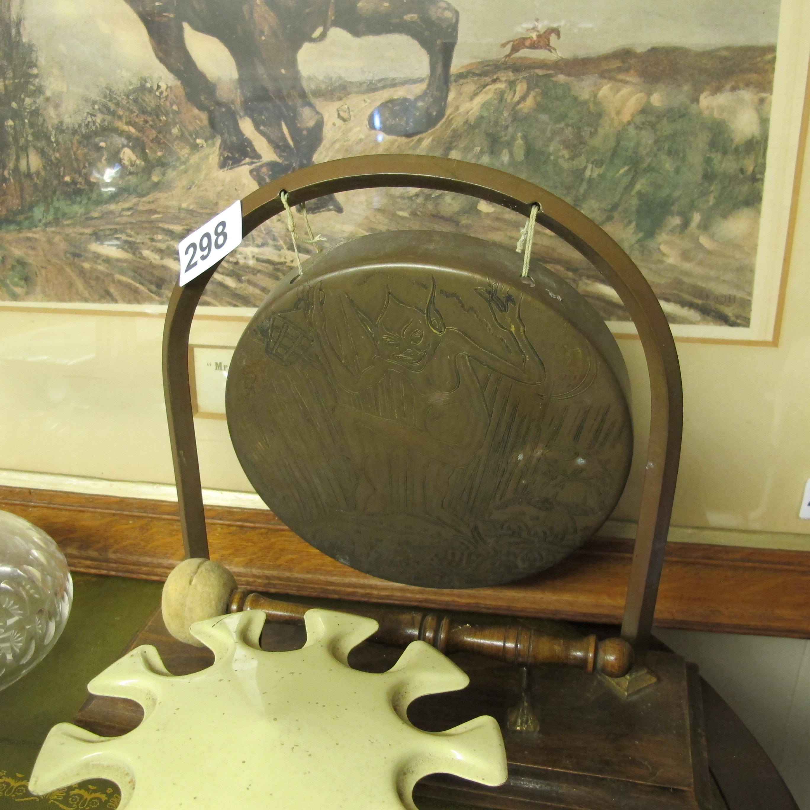 An Edwardian Brass and Oak Table Dinner Gong with Incised Decoration