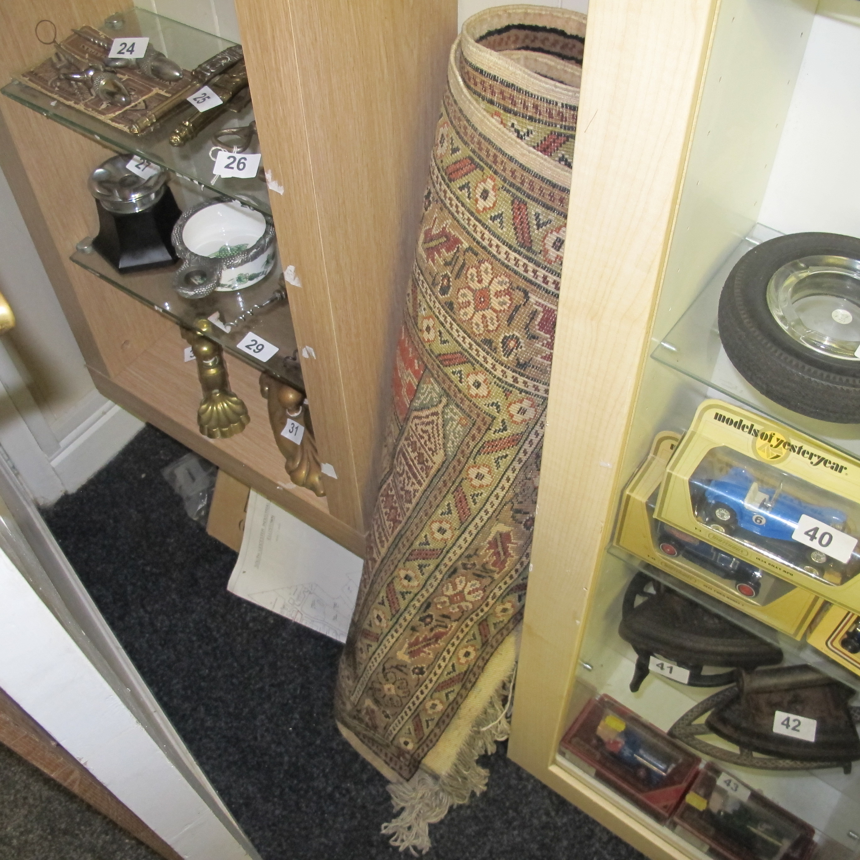 An Assortment of Vintage Matchbox Die-Cast Vehicles, Cast Iron Sad Irons, and a Persian-Style Runner